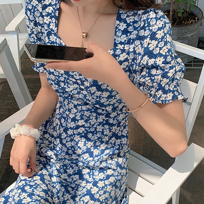 Slit Bubble Sleeve Black Square Neck Floral Chiffon Dress Female Fairy Forest Style Long Skirt Female Summer