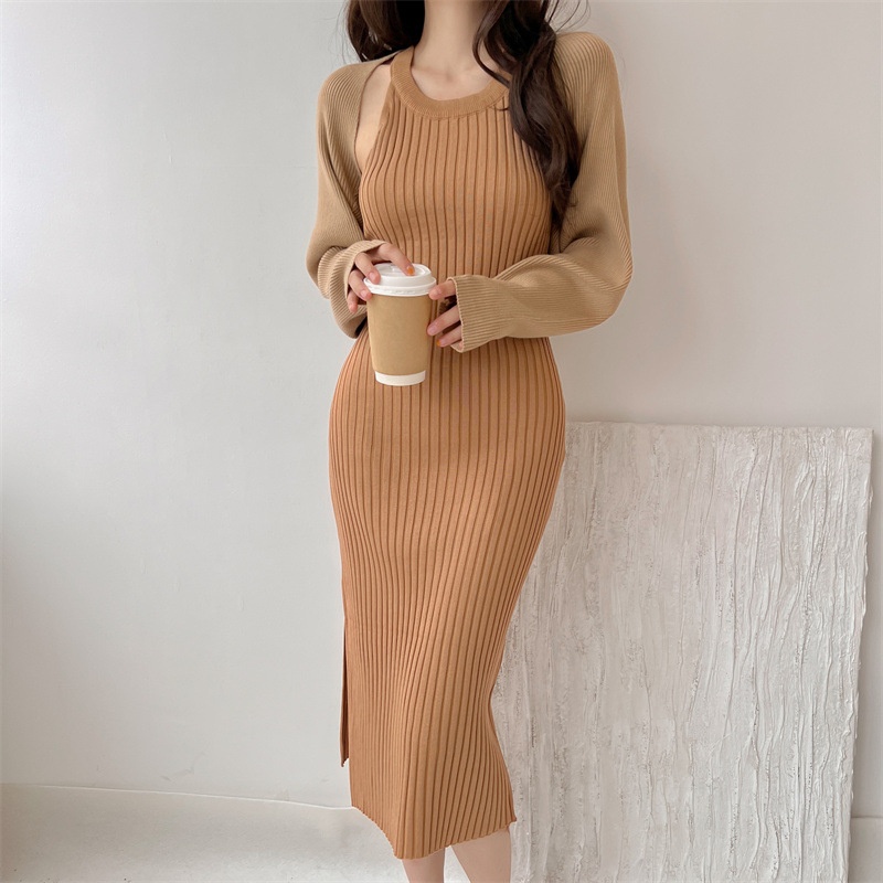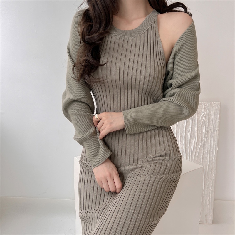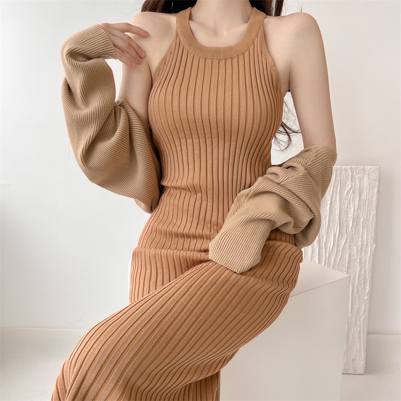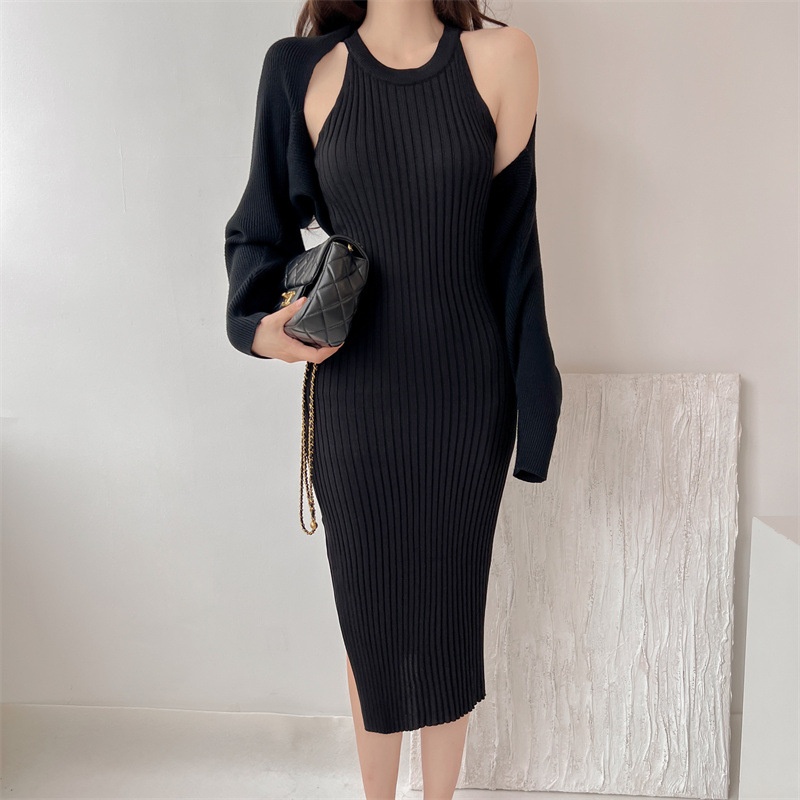 Spring And Autumn Slim Sexy Suspender Knitted Dress Two-piece Set Women's Temperament Suit Skirt Hip Long Skirt Women