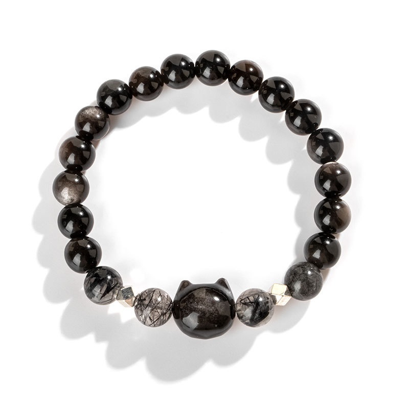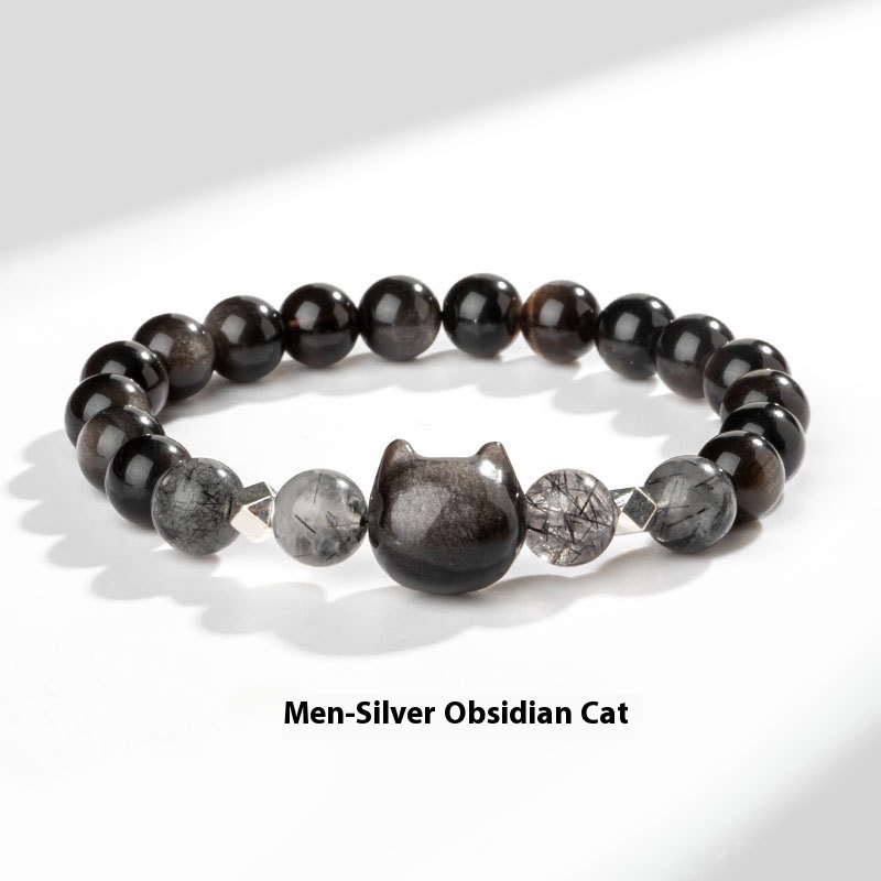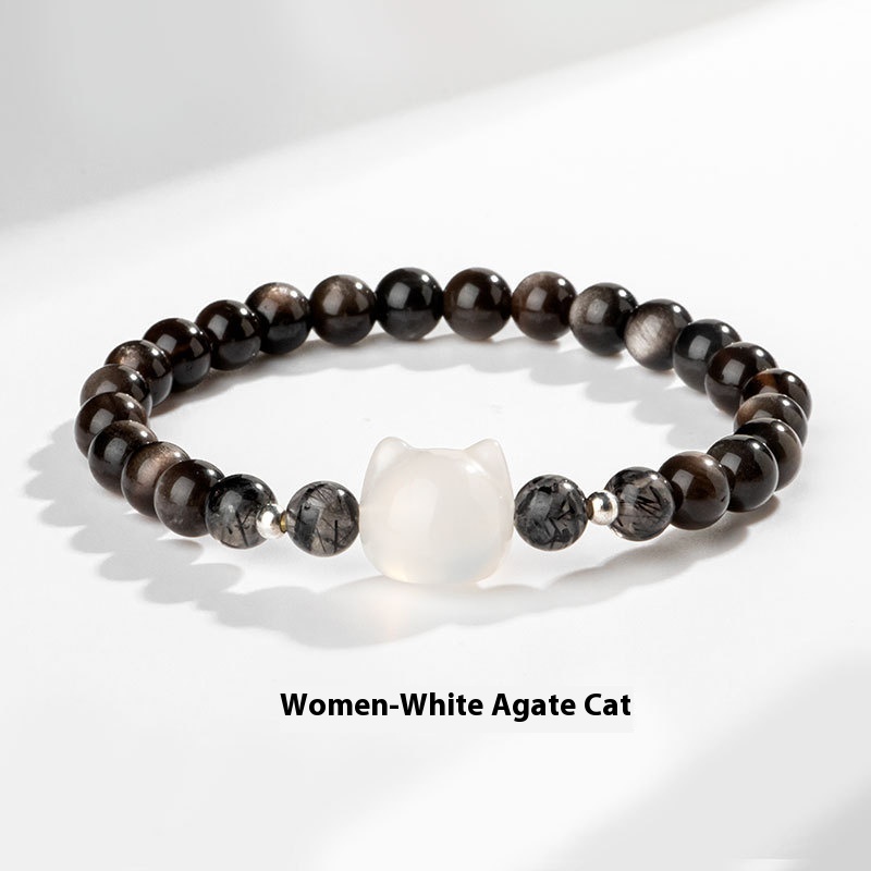 Natural Silver Yew Stone Beaded Bracelets,Obsidian Crystal Couple Bracelets,APair Of Niche Design Cat Bracelets For Women