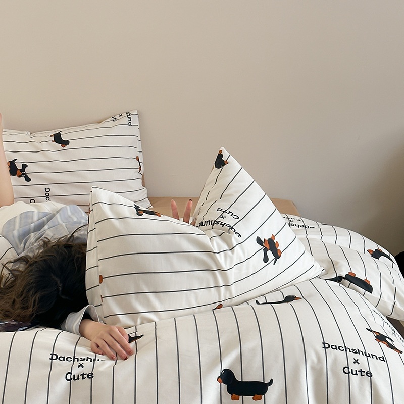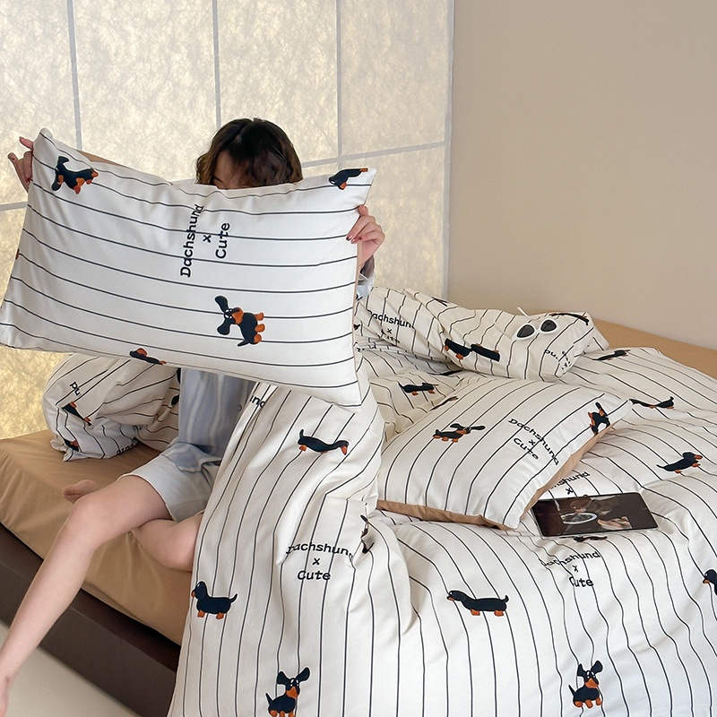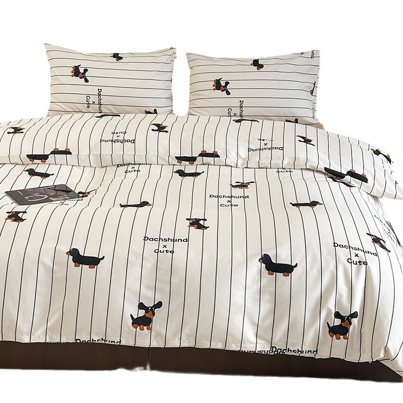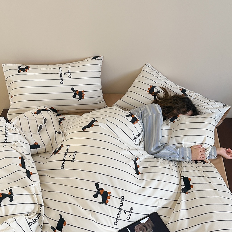 Cartoon Coffee Striped Sausage Dog Four-piece Set Pure Cotton Dormitory Bed Three-piece Set Bed Sheet Mattress Cover