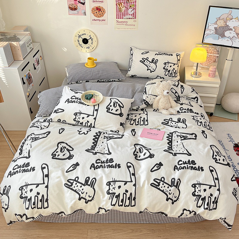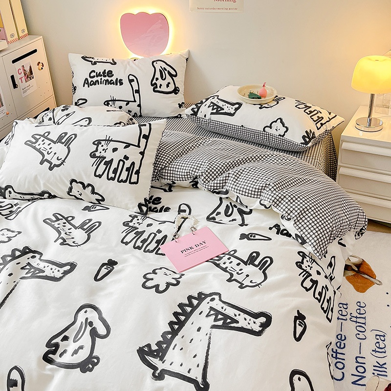 Black And White Graffiti Crocodile Kitten Pure Cotton Bed Set Of Four