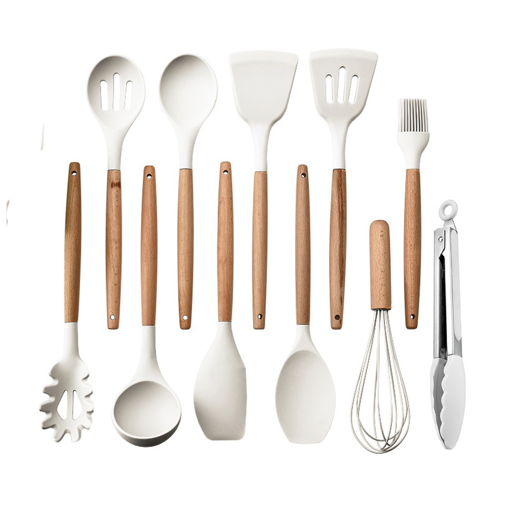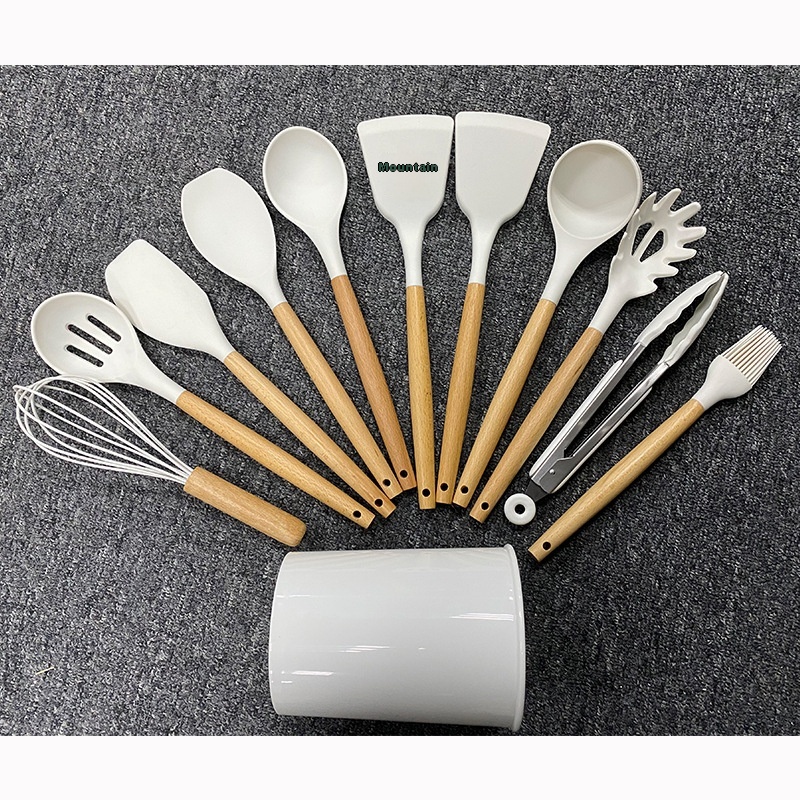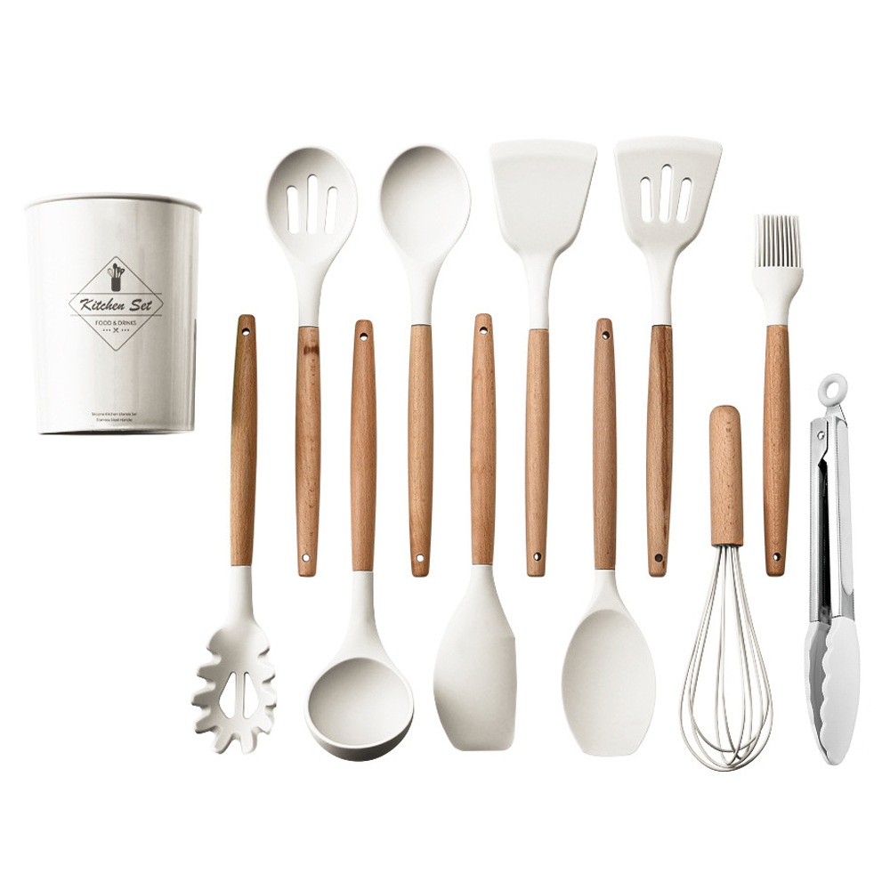 Storage Bucket Milk White Wooden Handle Silicone Kitchenware11-piece Set Non-stick Spatula Kitchenware Set11-piece Set