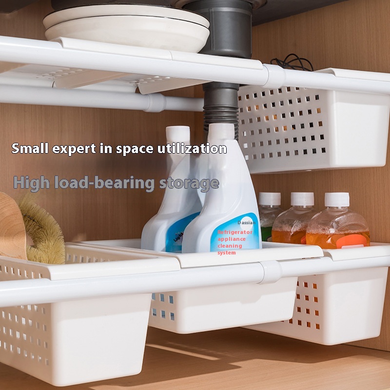 Japanese Style Under Sink Punch-free Telescopic Rod Storage Rack Kitchen Hanging Rod Seasoning Rack Cabinet Plastic Storage Basket