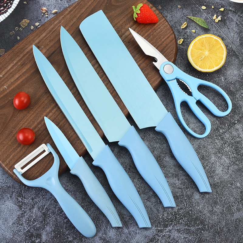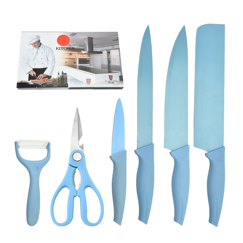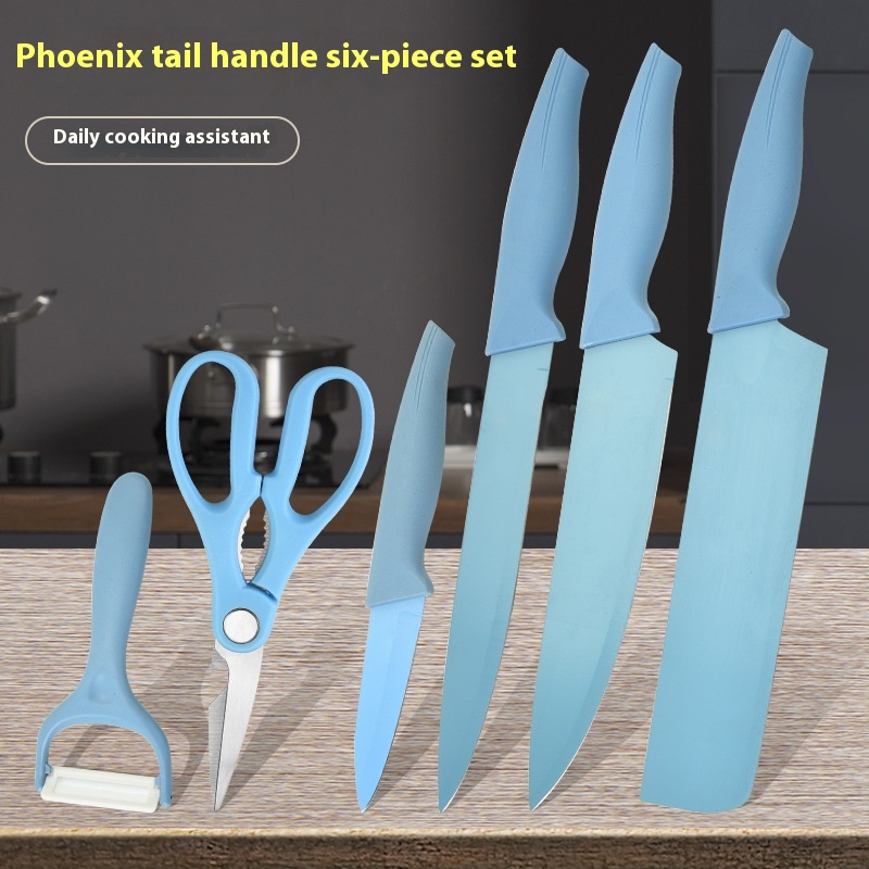 Yangjiang Kitchen Knife Stainless Steel Spray Paint Knife Blue Dovetail Handle Six-piece Knife Set Direct
