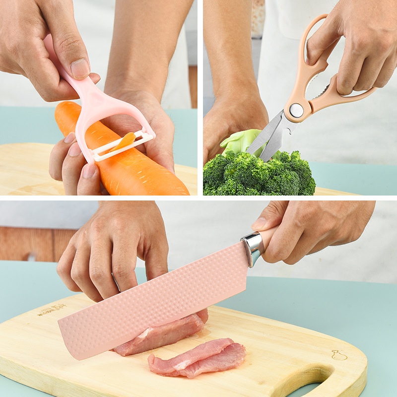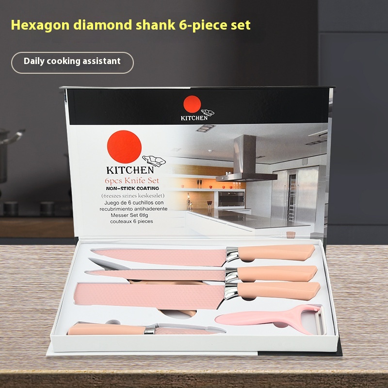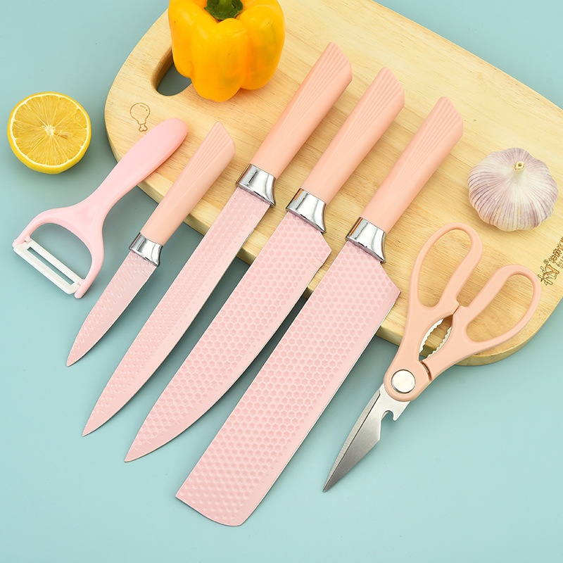 Yangjiang Kitchen Knife Stainless Steel Spray Paint Knife Pink Hexagonal Diamond Pattern Scallop Handle Six-piece Knife Set Kitchen Knife