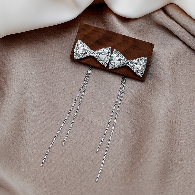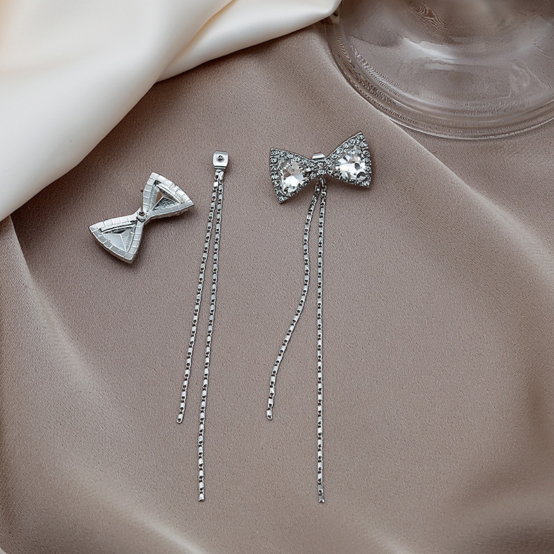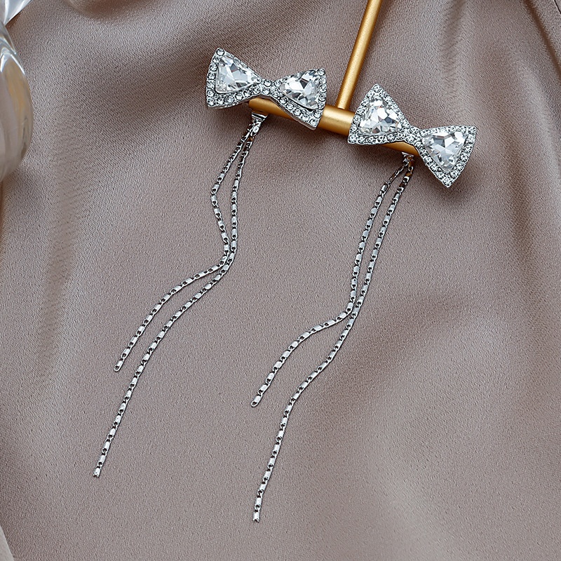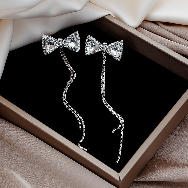 Silver Needle Crystal Bowknot Earrings Long Tassel Temperament Earrings Fashion Simple Net Red Personality Earrings For Women