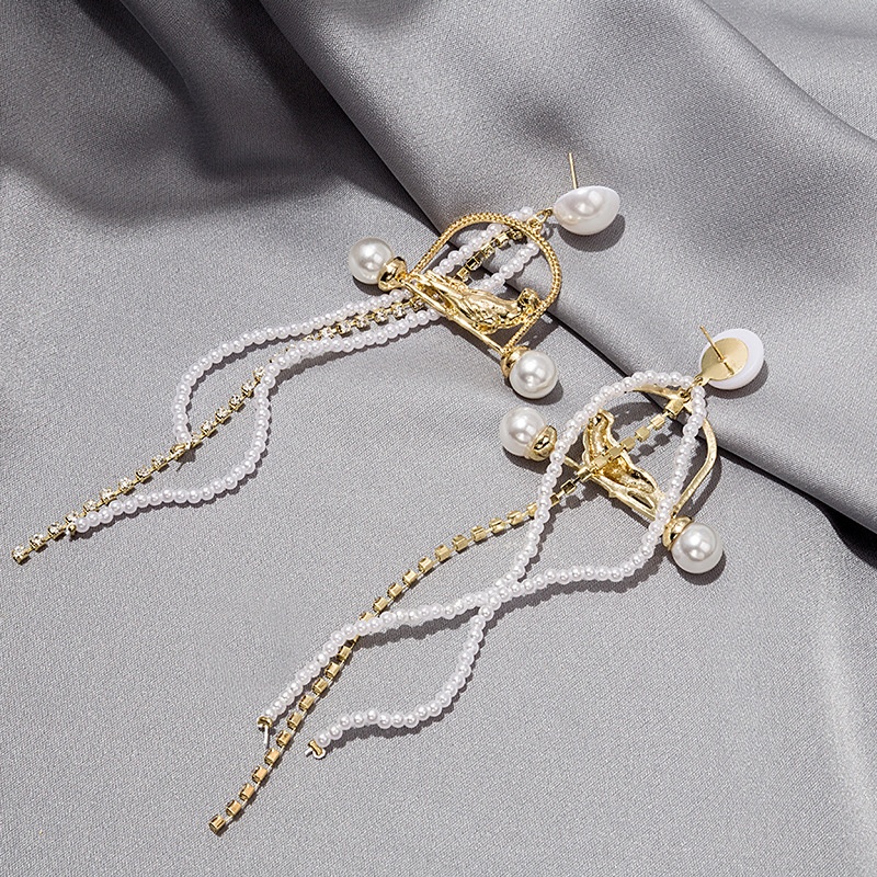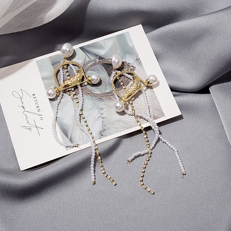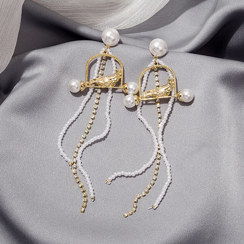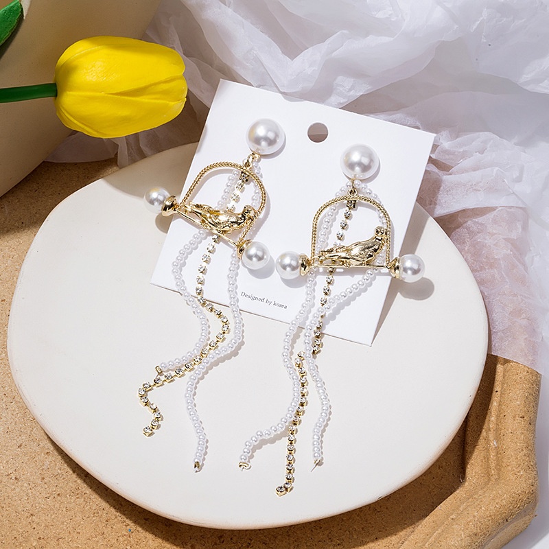 Silver Pin Long Tassel Metal Pearl Parrot Stud Earrings,Long Elegant Earrings
