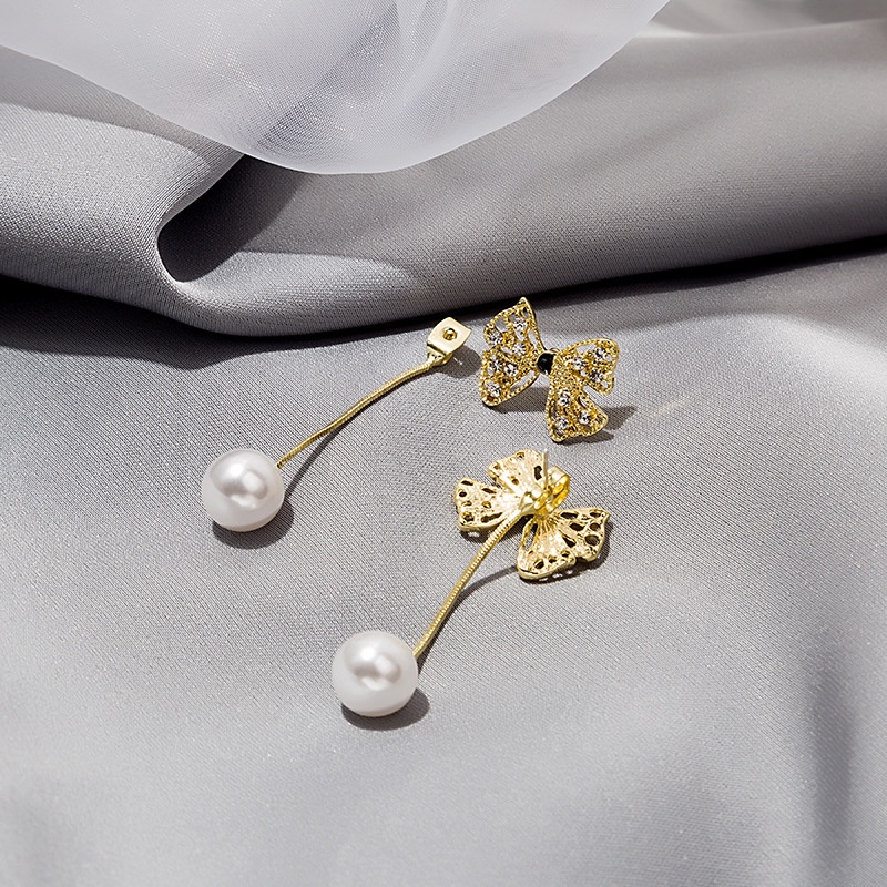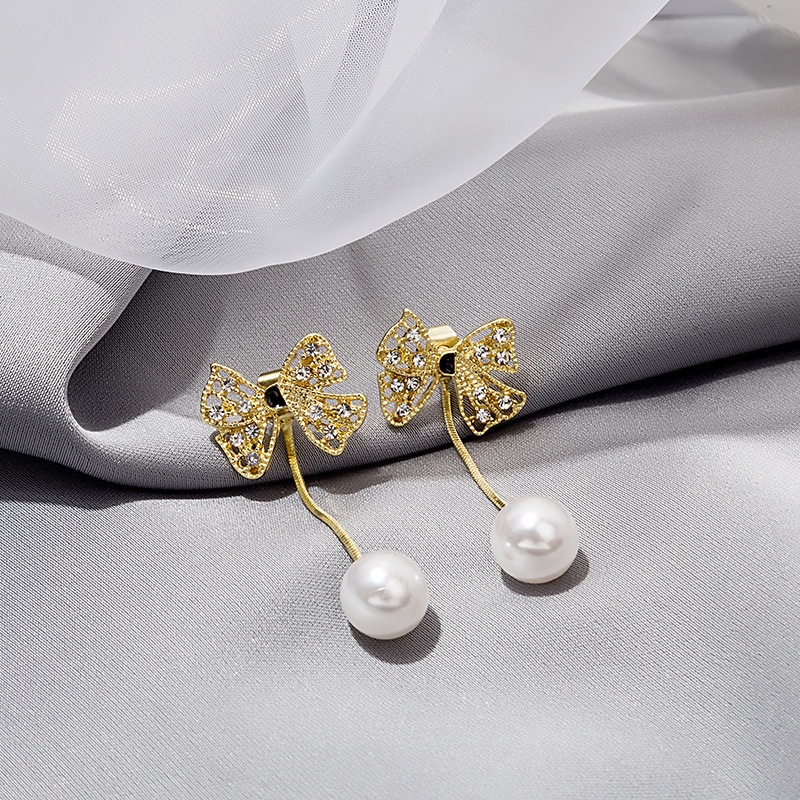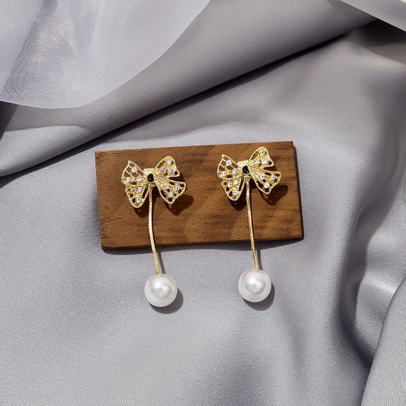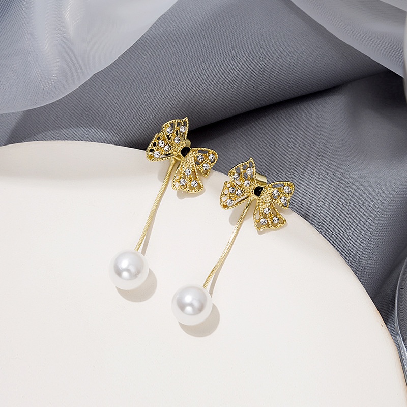 Diamond-set Long Tassel Bow Pendant Pearl Earrings,Two-way Wear Style