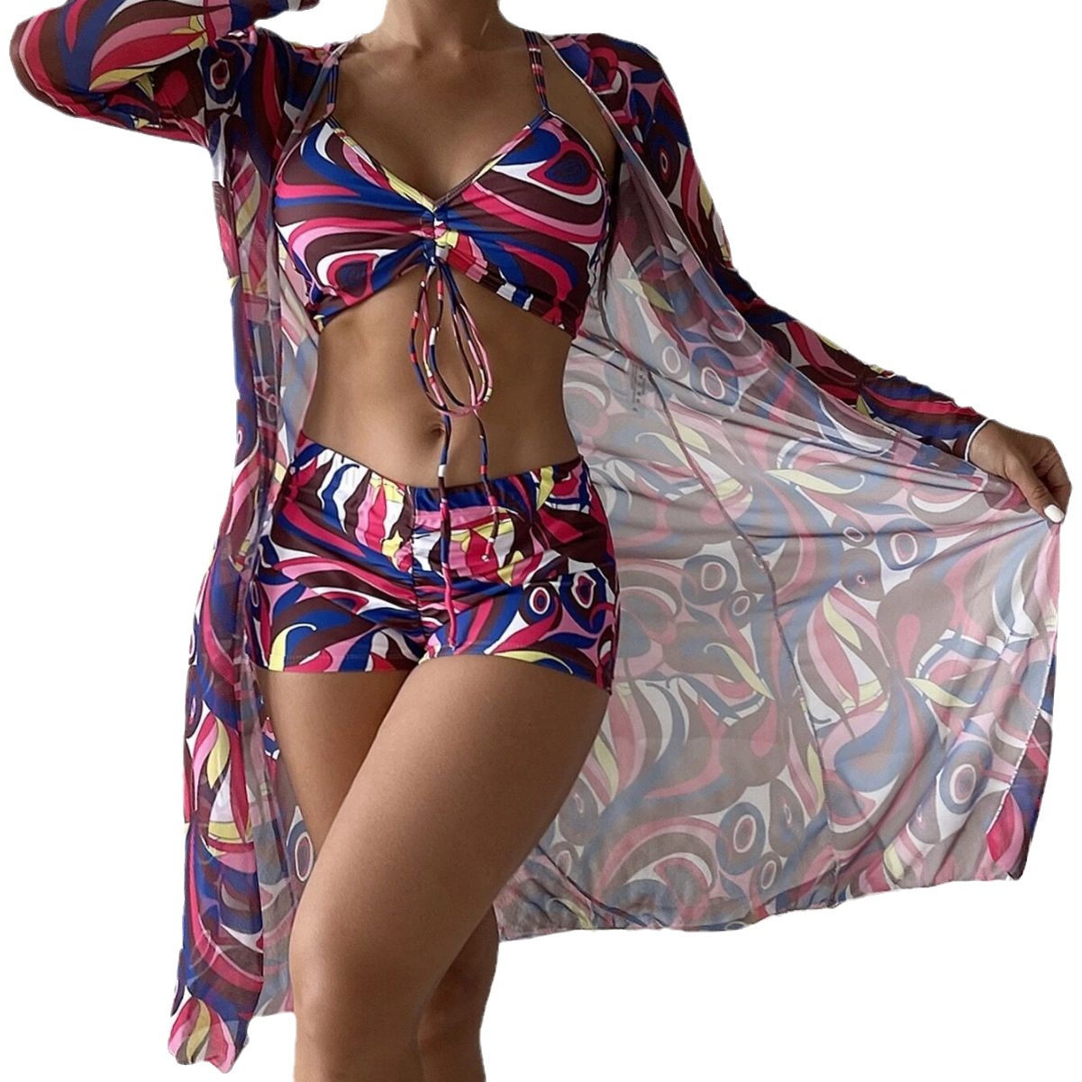 Split European And American Foreign Trade Bikini Swimsuit Three-piece High Waist Long Sleeve Tight Sunscreen Blouse Internet Celebrity