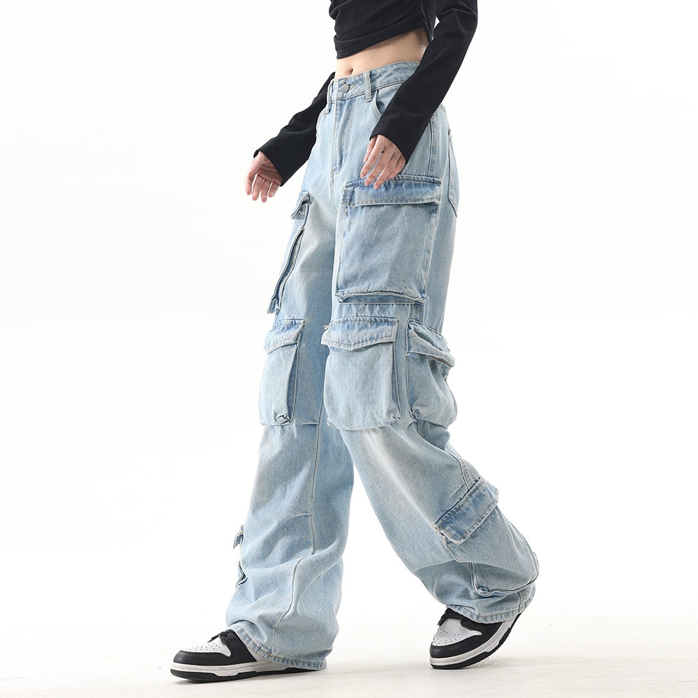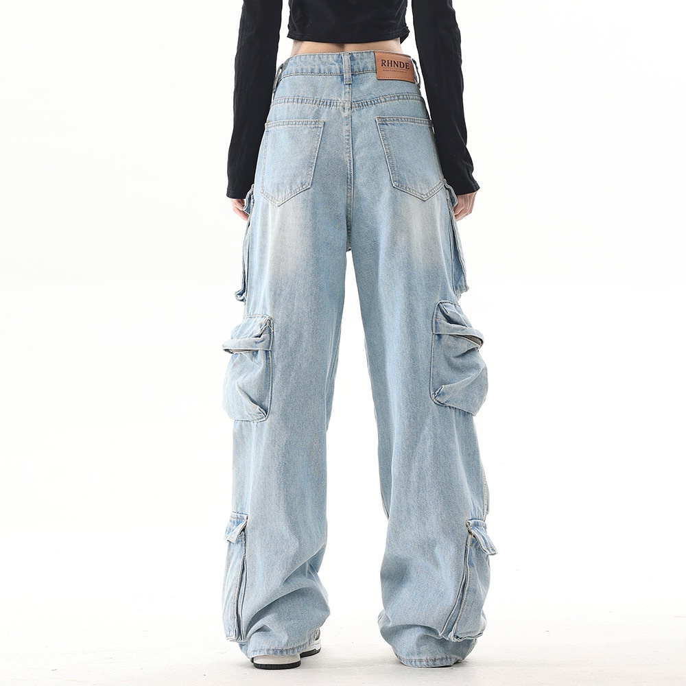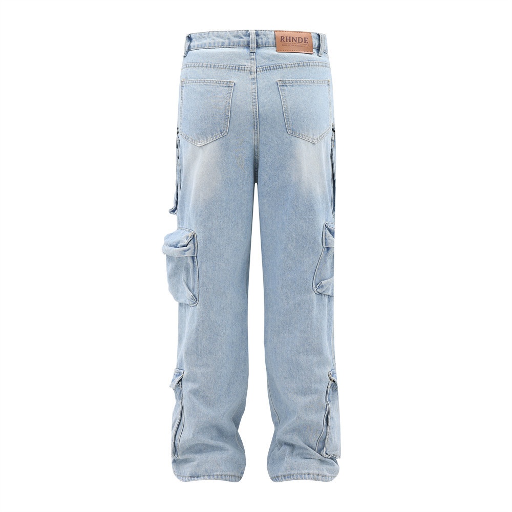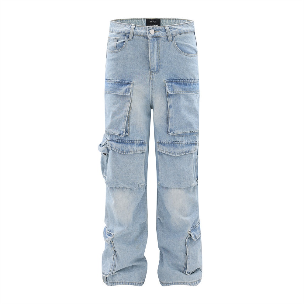 Vibey Washed Denim Multi-pocket Overalls For Men And Women,High Street Design,Niche Loose Wide-leg Straight Trousers