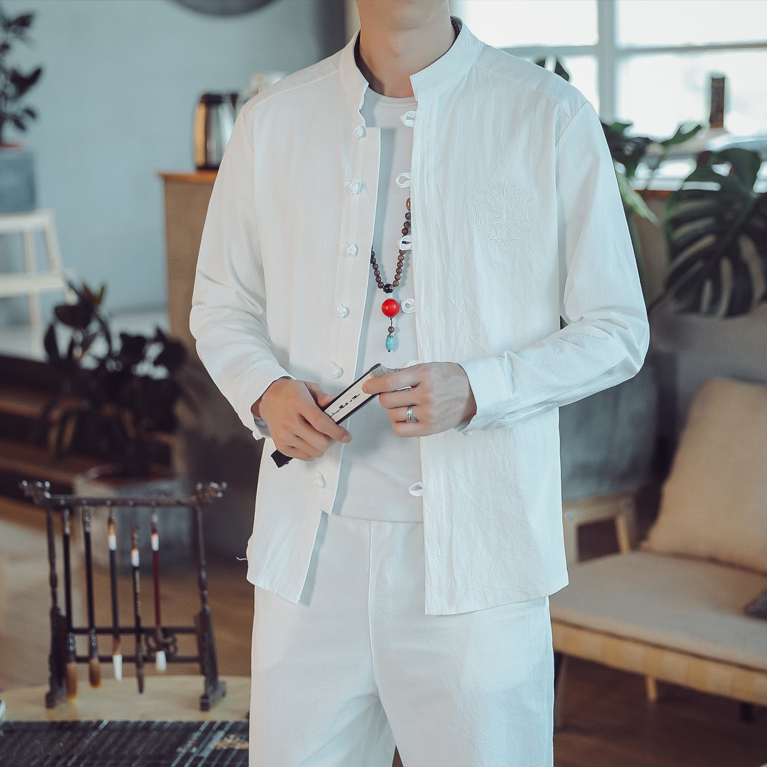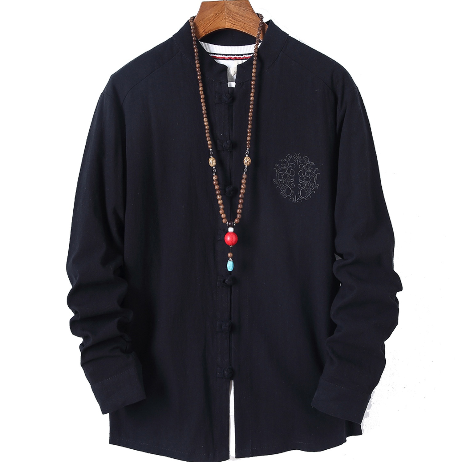 2019 Autumn Chinese Style Embroidered Large Size Cotton And Linen Shirt Men's Retro National Large Size Long Sleeve Stand Collar Shirt
