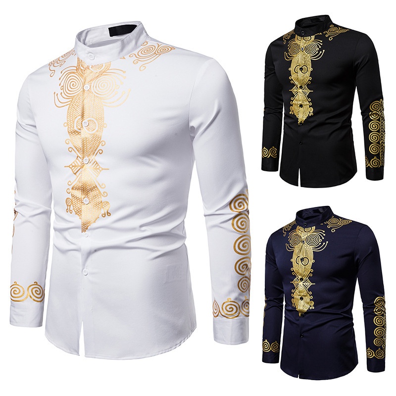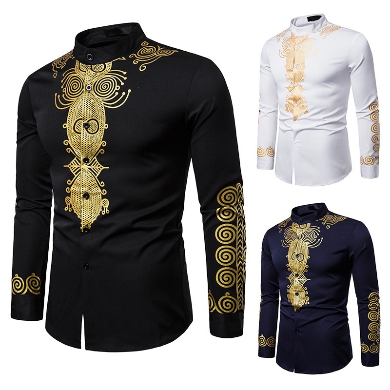 Foreign Trade Casual Straight Men's Fashion Ethnic Style Hot Stamping Totem Slim Shirt African Style Pullover Shirt