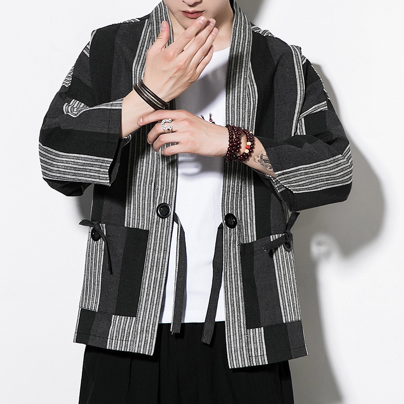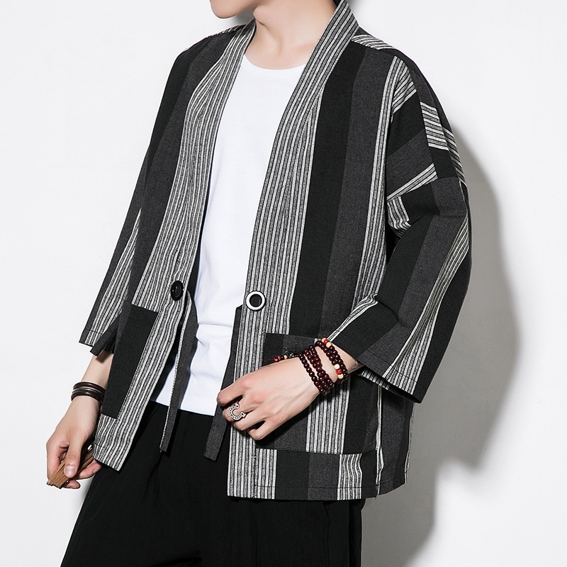 Chinese Style Summer Men's Striped Cotton And Linen Hanfu Retro Large Size Fashion Linen Cardigan Tang Suit Men