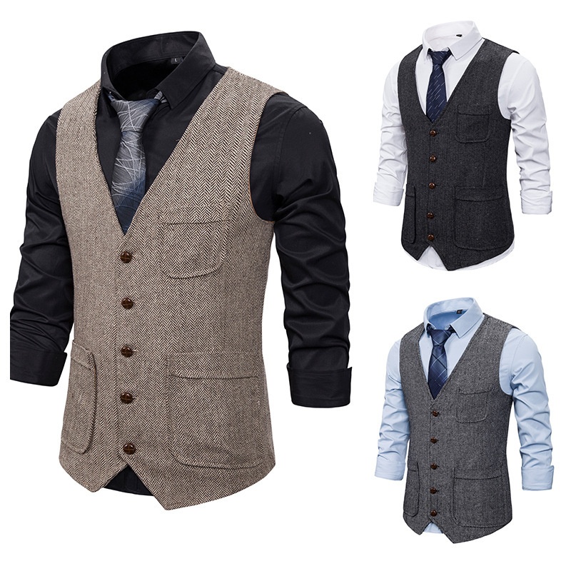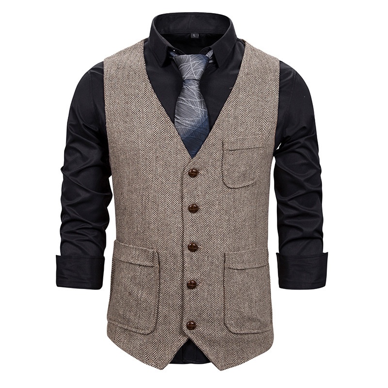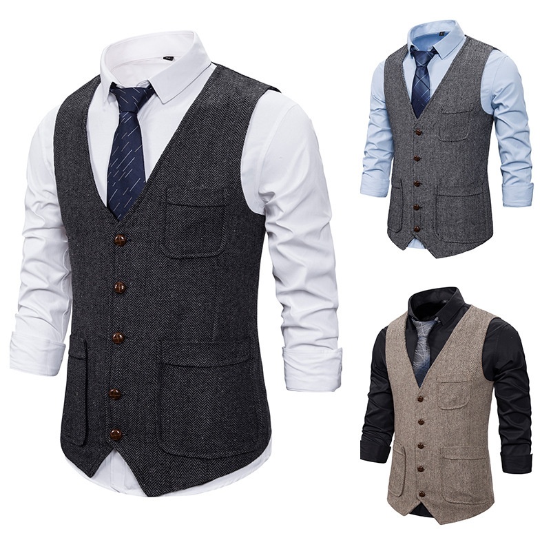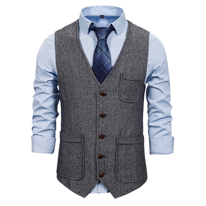 Foreign Trade Men's Herringbone Wool Double Pocket Single Breasted Vest Slim Fit V-neck Men's Suit