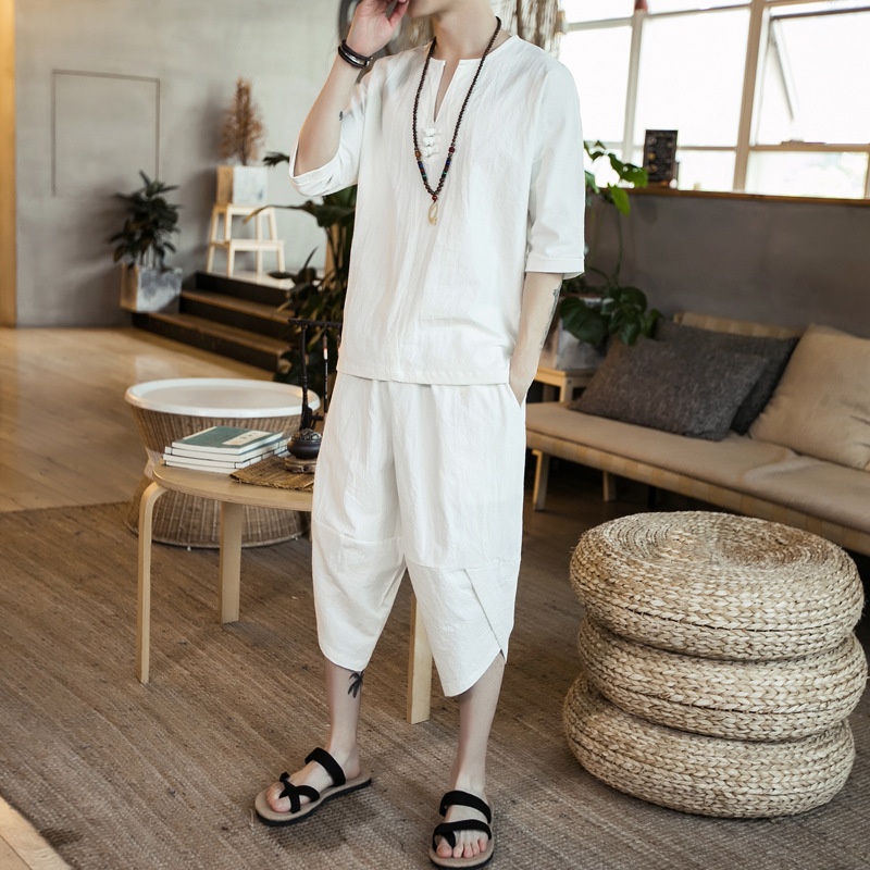 Chinese Style Linen Solid Color Three-quarter Sleeve Button T-shirt Suit Three-quarter Bloomers Men's Youth Suit