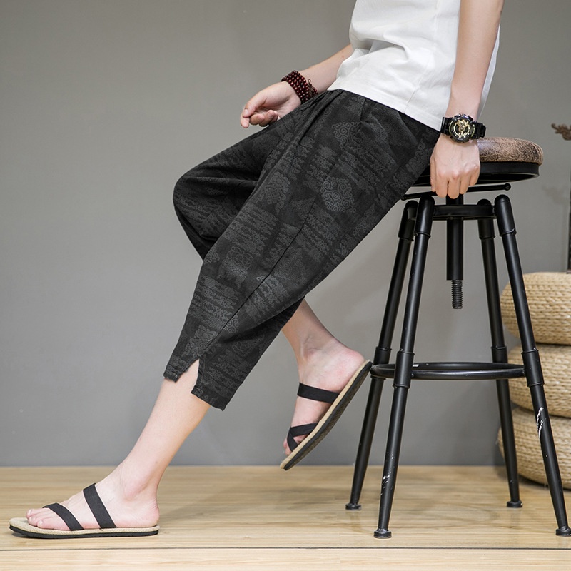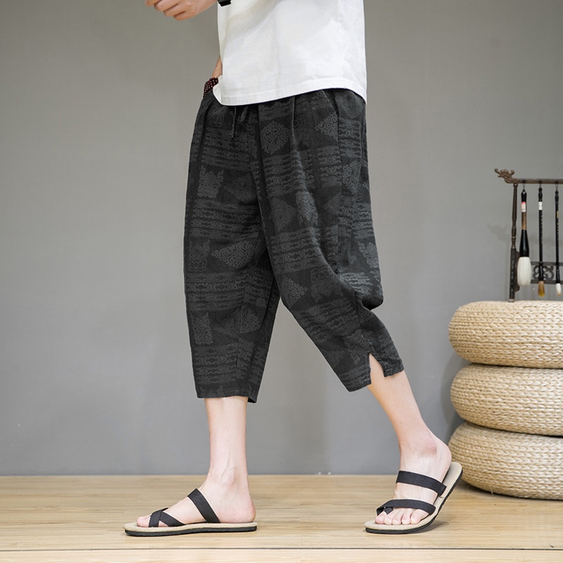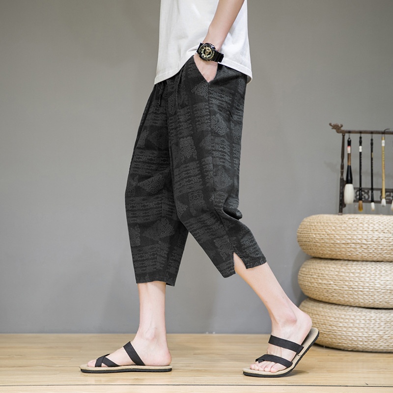 Summer Loose Youth Chinese Style Men's Large Size Retro Cotton And Linen Jacquard Cropped Trousers