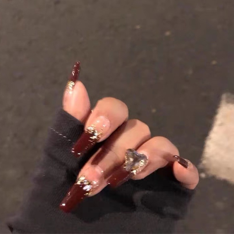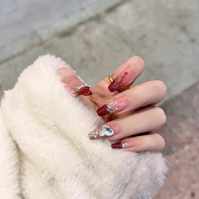False Nail Patches French Wine Red Love Diamond White Year Removable Wearable Nails Manicure Finished Nails