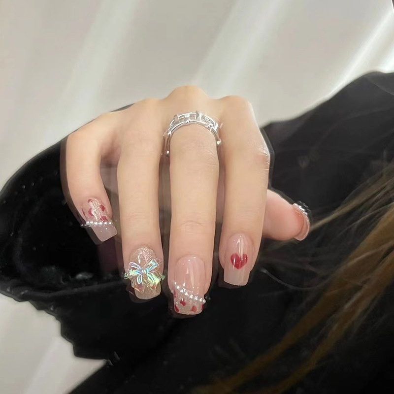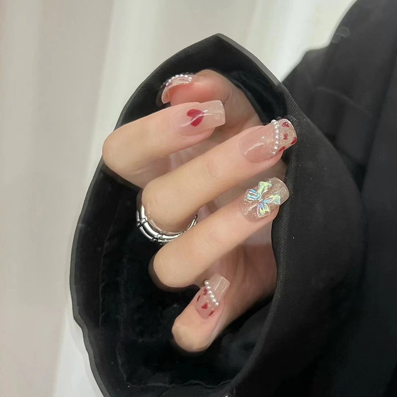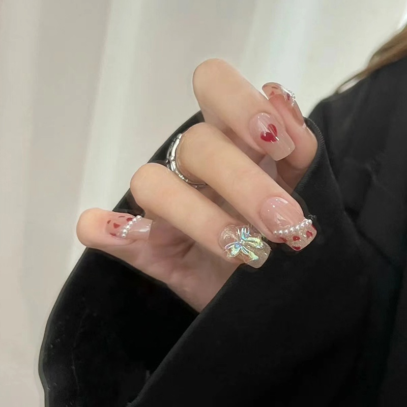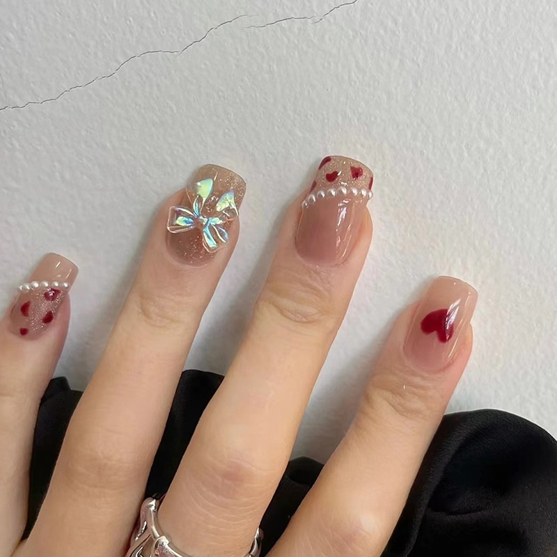 Crystal Cat's Eye Pearl Heart Bow White Fairy Nail Art Short False Nails Detachable Wearable Nail Piece