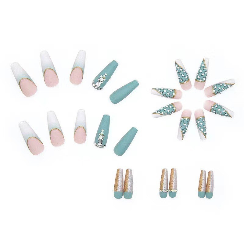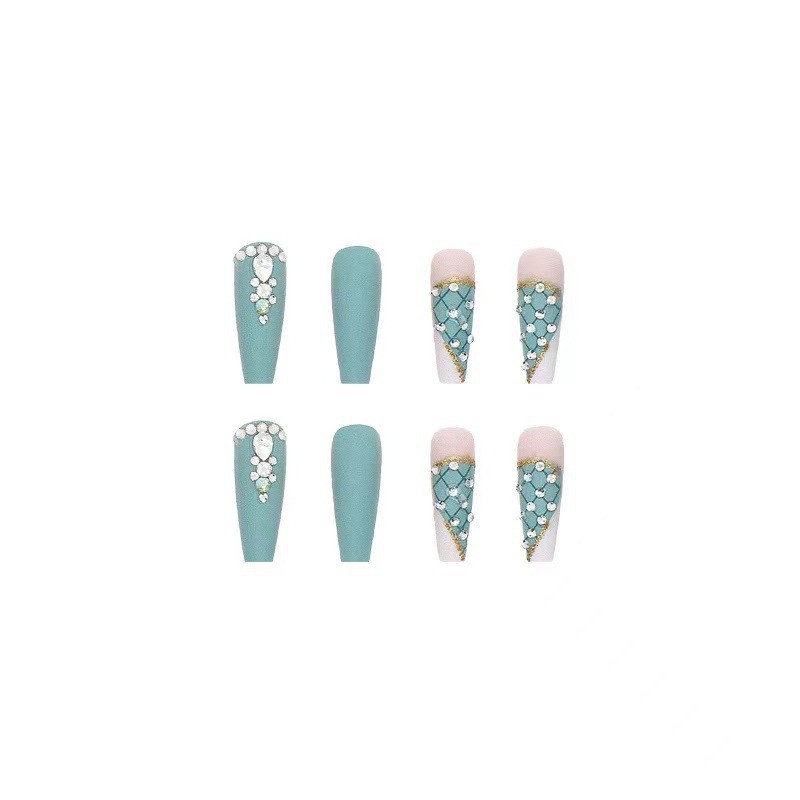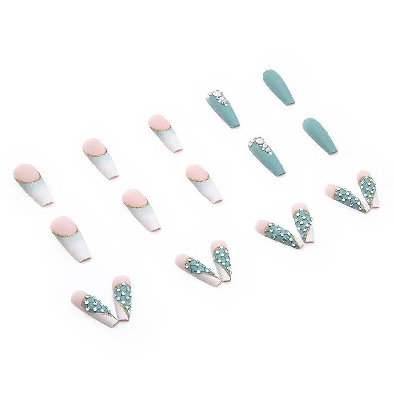 Nail Stickers Finished Product Haze Green Checkered Diamond Style Ballet Long Nails Wearable Nail Art Press On Nails