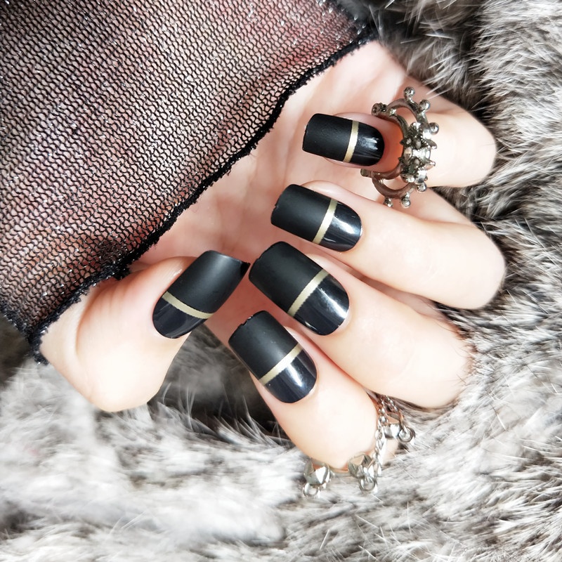 24 Pieces Of Black Matte Gold Line False Nails Wearable Detachable Nail Art Bridal Style Nail Art Finished Nail Patches