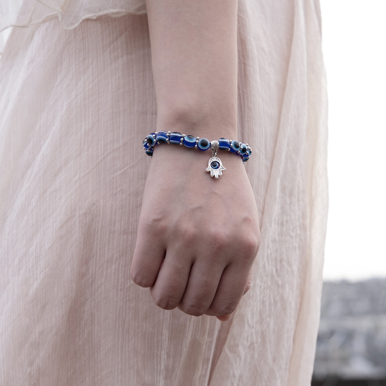 Classic Blue Eye Palm Round Glass Bead Bangle