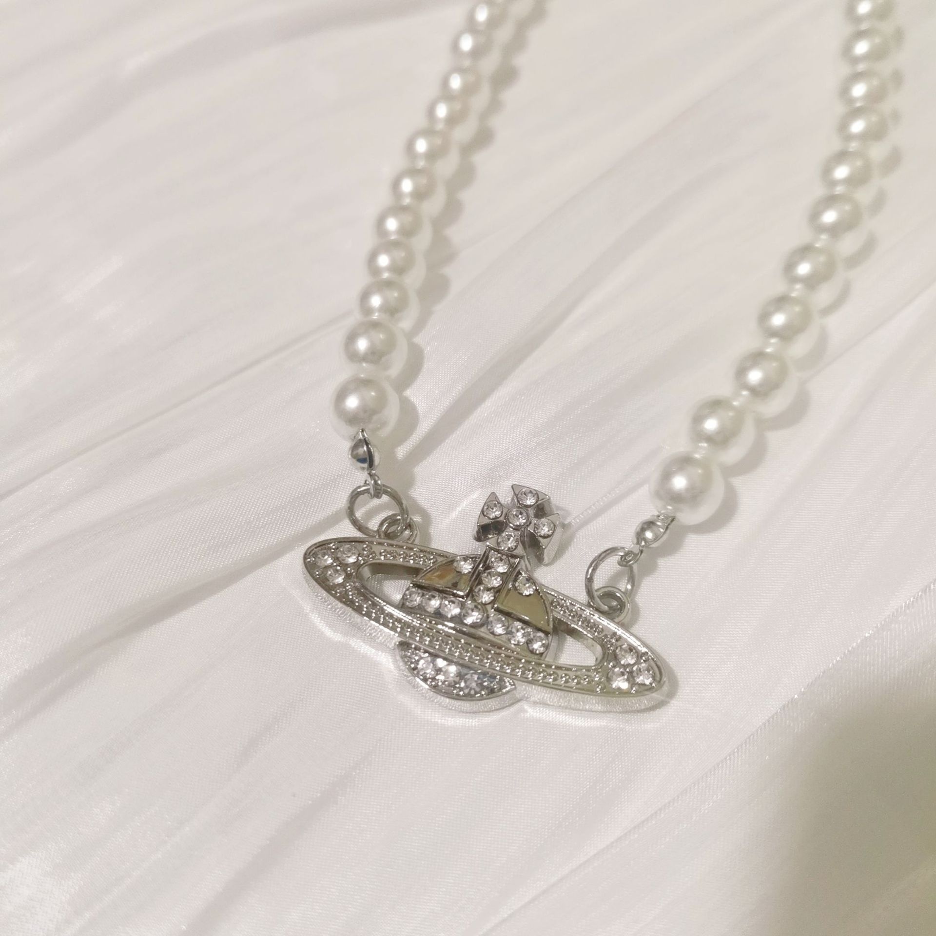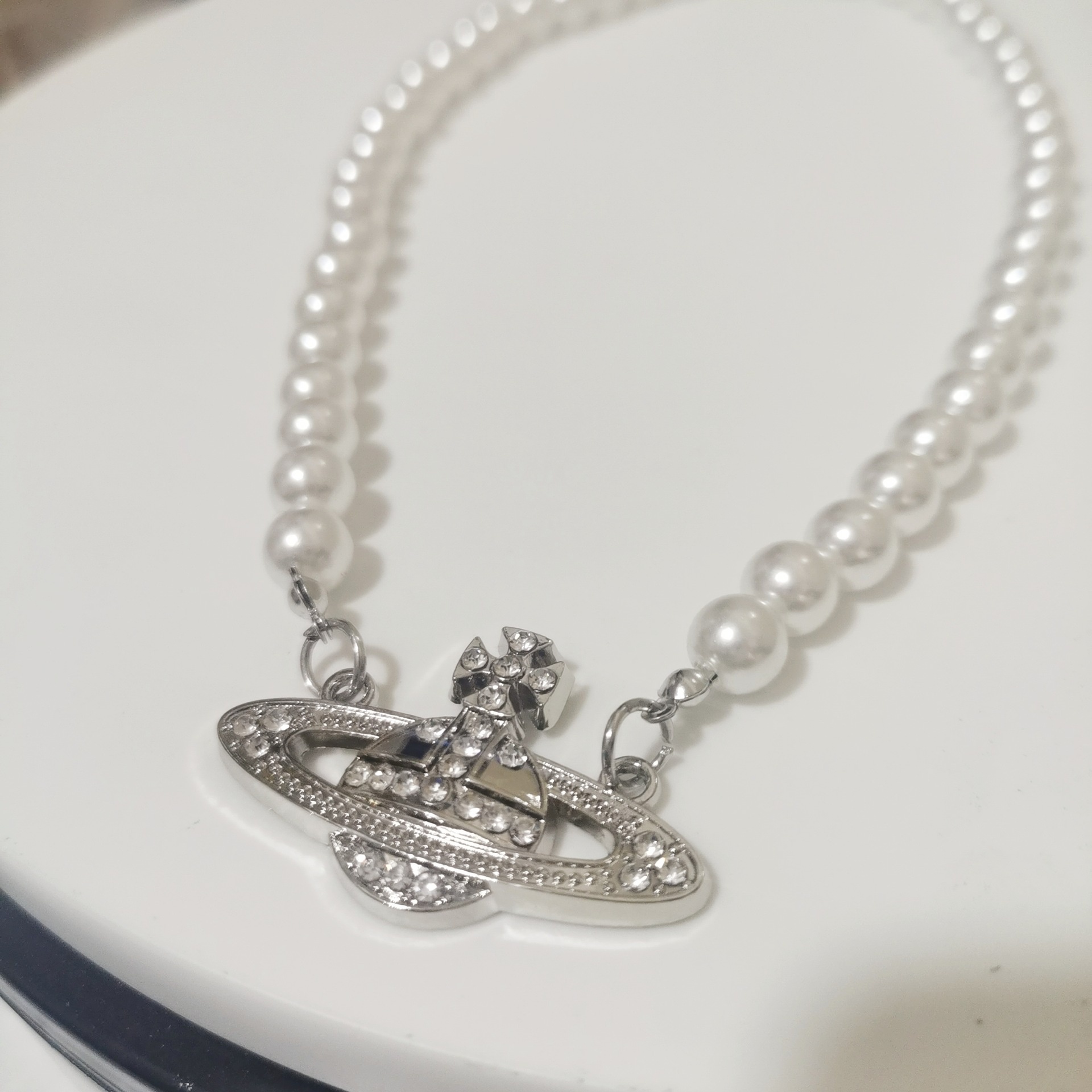 Saturn Pearl Necklace With Diamond-set Planet Pendant,Clavicle Chain