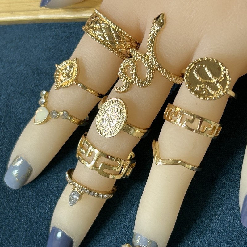 European And American Alloy Jewelry Fashion Personality Exaggerated Carved Buddha Statue Diamond Snake Shape10-piece Ring Set For Women