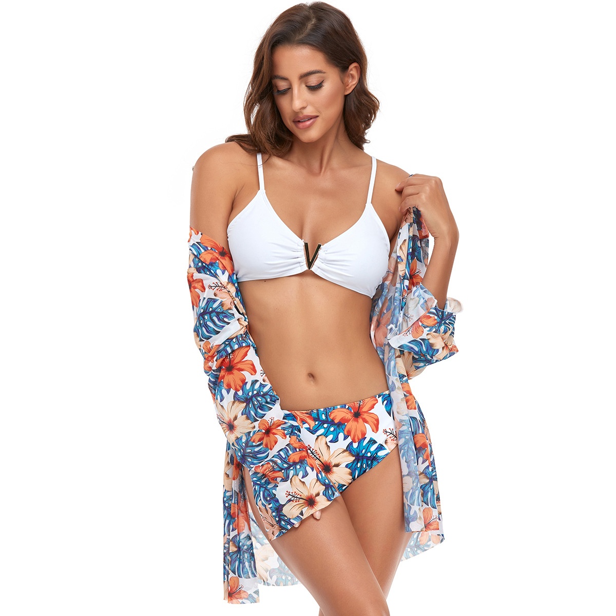 European And American Split Mesh Three-piece Swimsuit Full Body Flower Full Print Briefs Swimsuit
