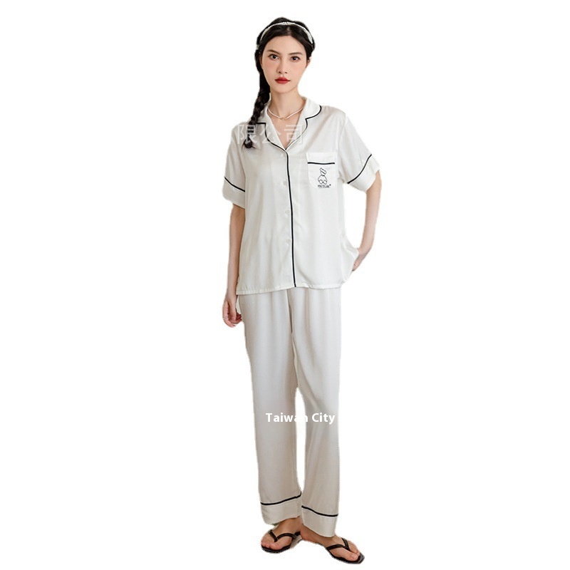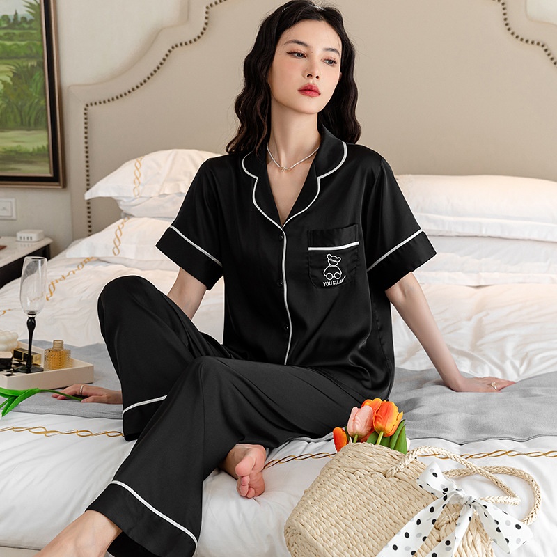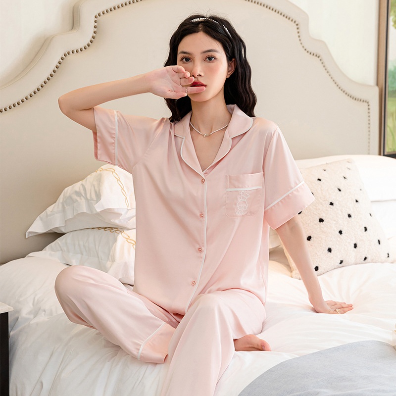 Pajamas Women Summer Satin Ice Silk Short Sleeve Pants Thin Simple Lapel Solid Color Bear Embroidered Cardigan Home Clothes