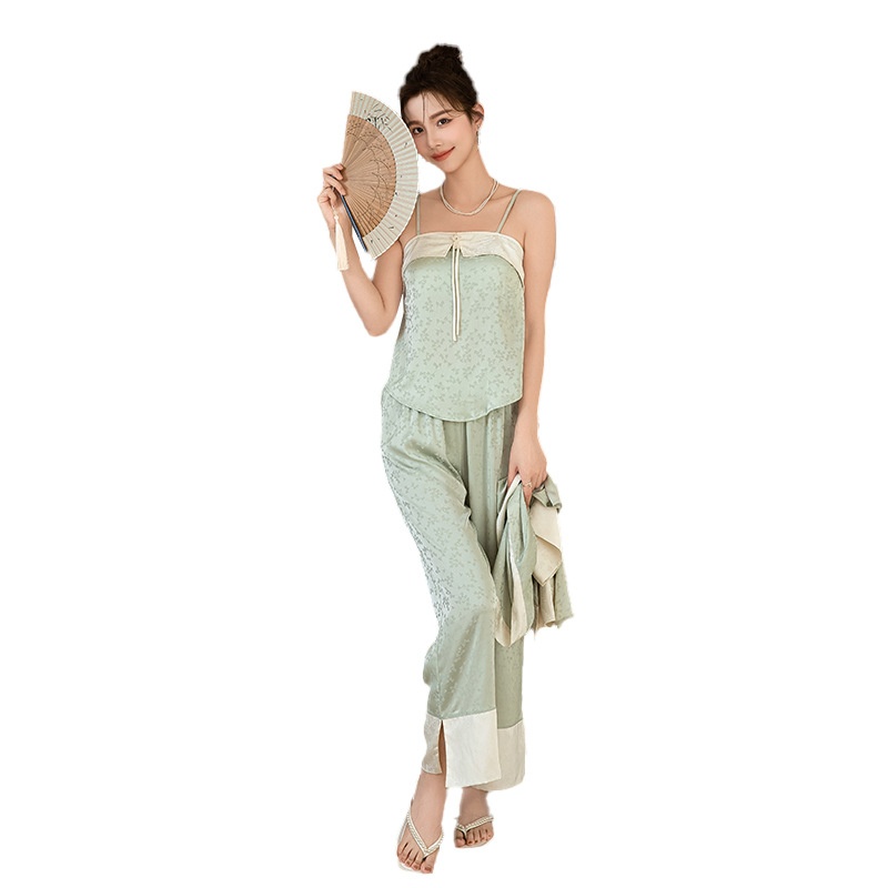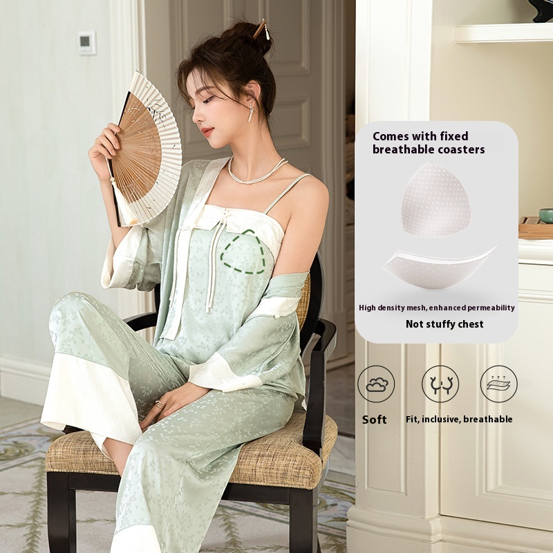 Thin Cardigan Chinese Retro Style Jacquard Ice Silk Pajamas Women Spring And Autumn With Chest Pad Three-piece Home Clothes