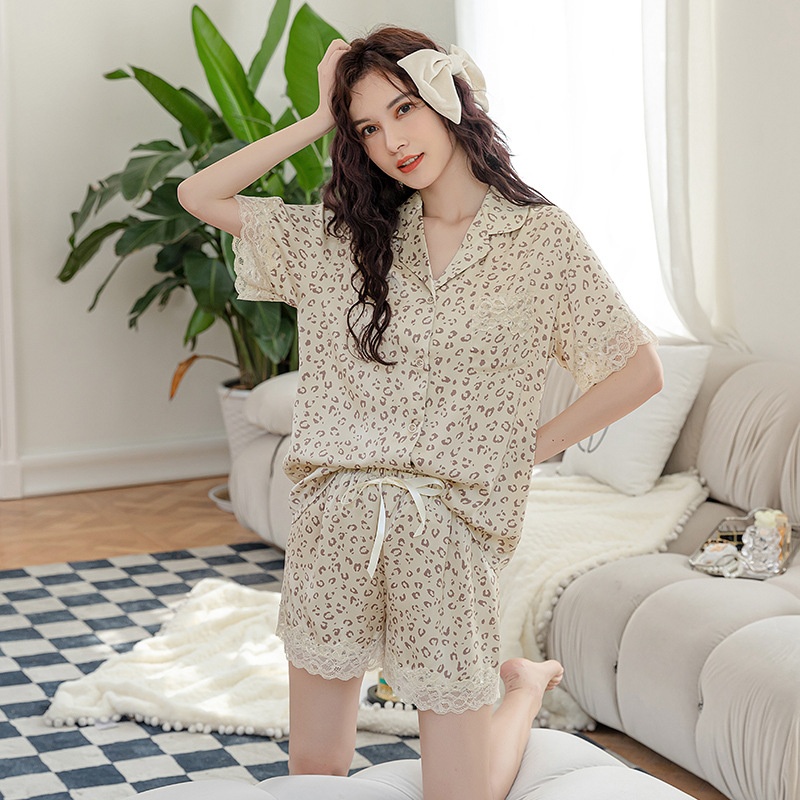 Victoria's Secret Sexy Leopard Print Ice Silk Pajamas Women's Summer Short-sleeved Shorts Thin Net Celebrity Breathable Home Clothes