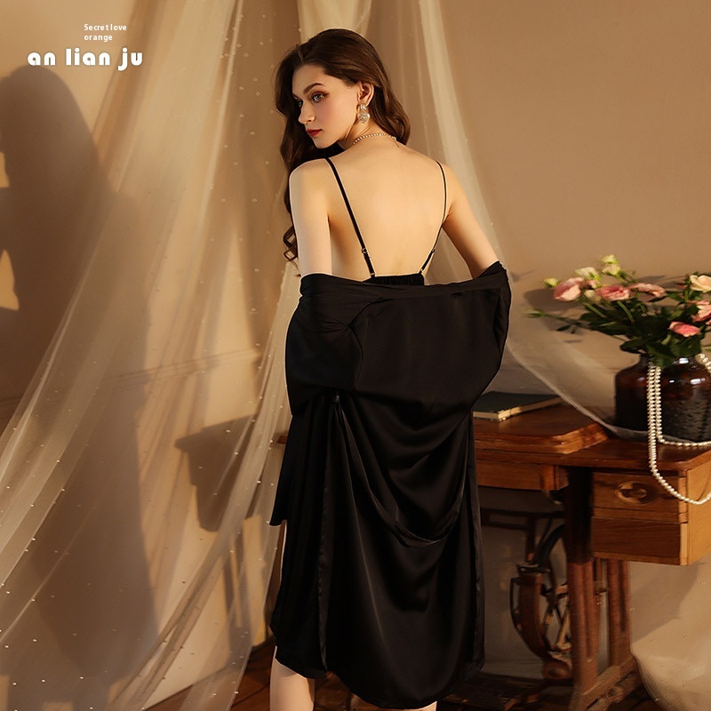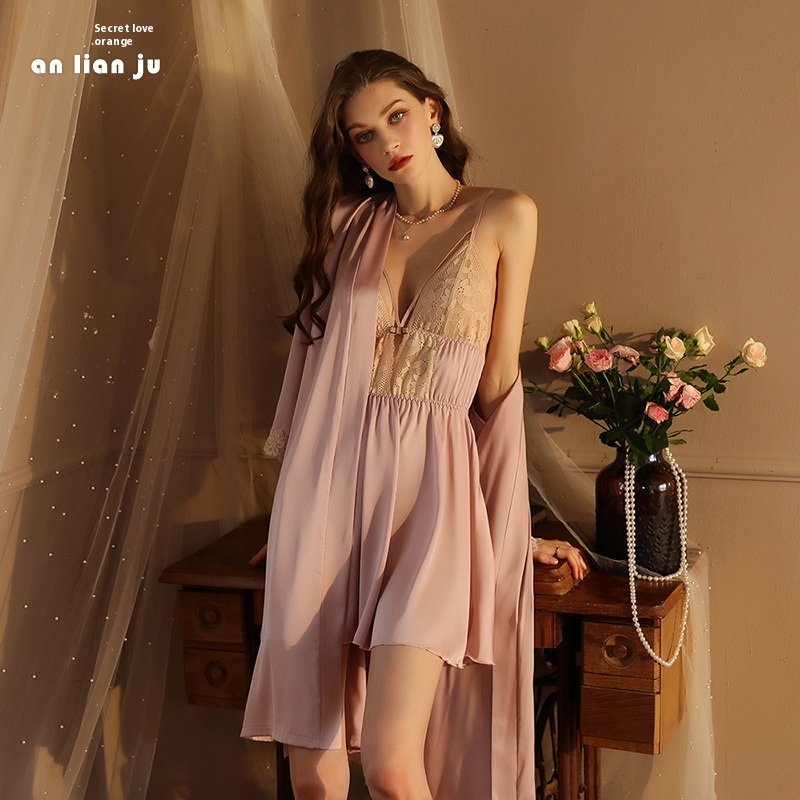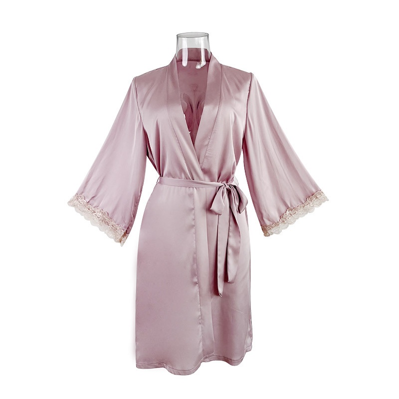 Feiyun Satin Pajamas Women's Cuffs Splicing Sexy Lace Lace Nightgown Bathrobe Home Clothes417