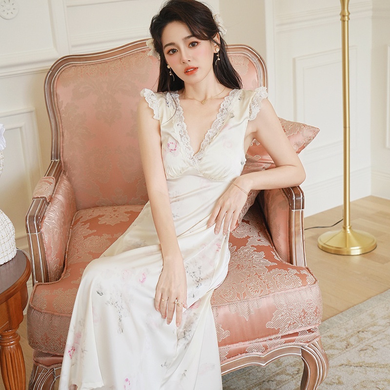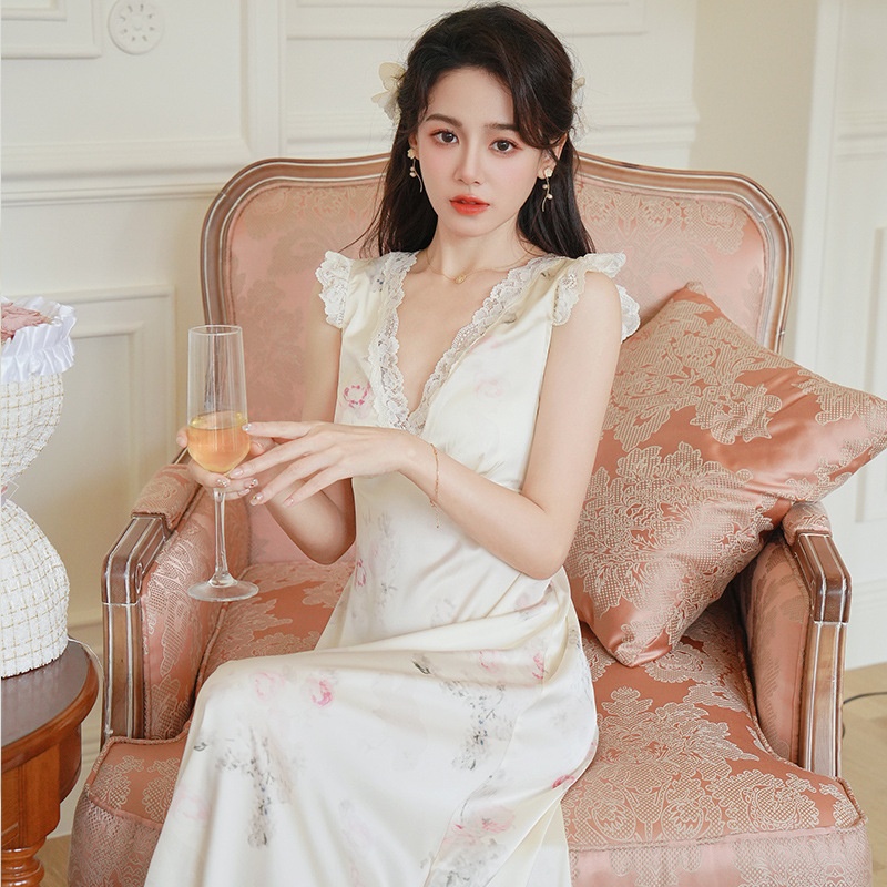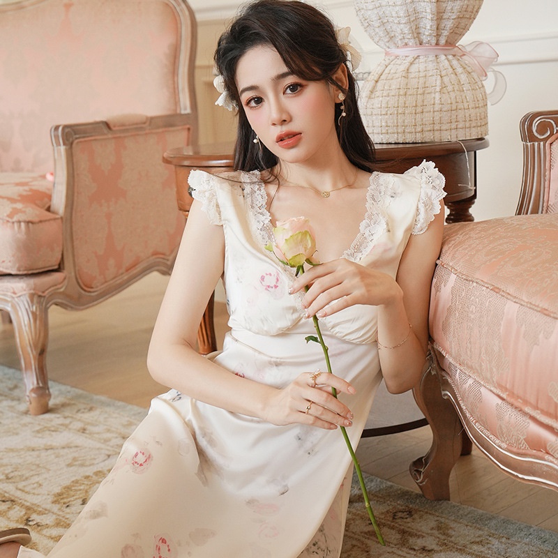 French Summer Long Ice Silk Nightdress Fairy Pajamas Thin Loose Outerwear Home Clothes Women