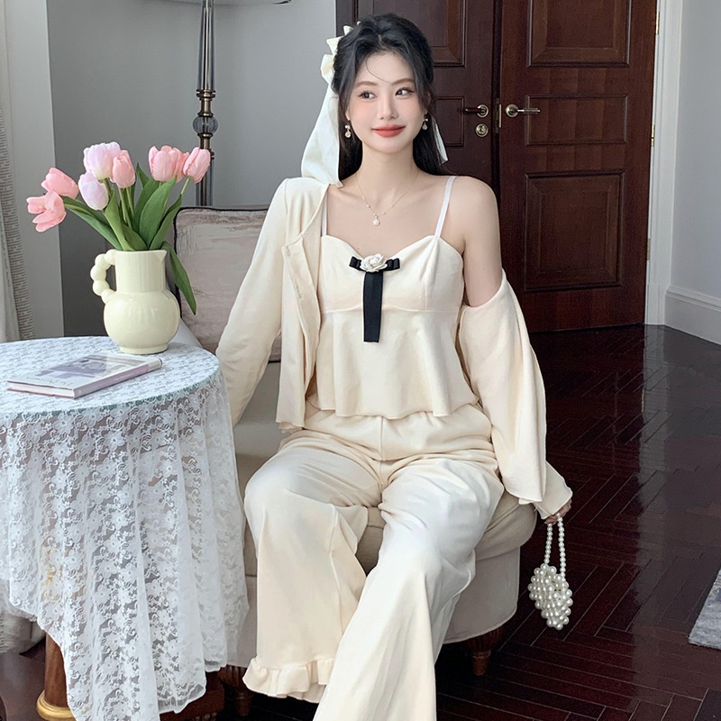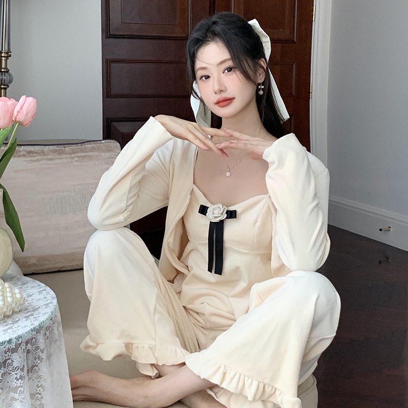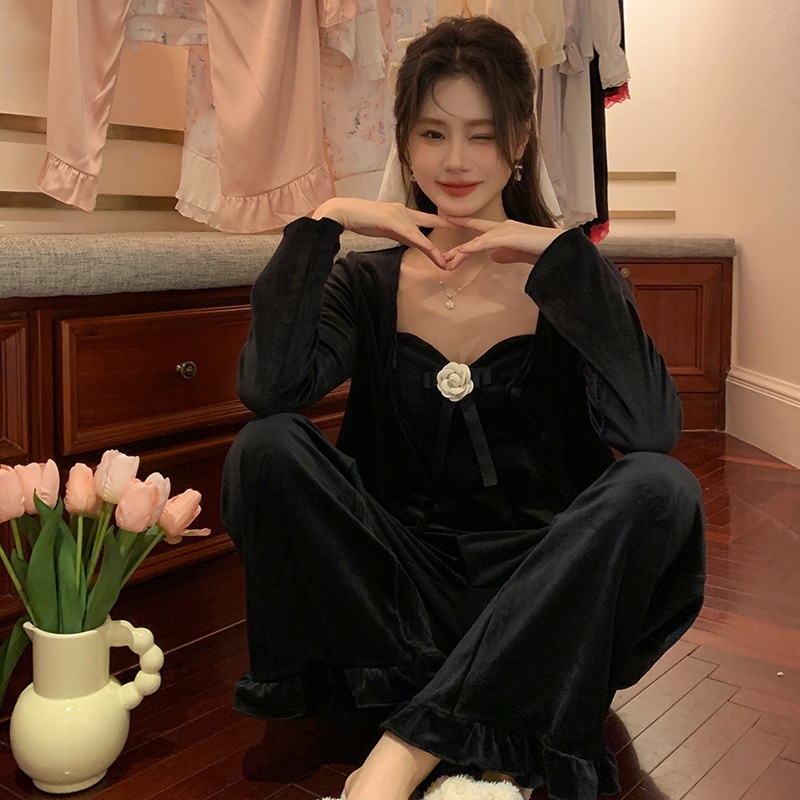 French Style Suspender Pajamas Set Autumn And Winter Three-piece Set Double-sided Island Velvet Long-sleeved Suit Can Be Worn As Home Clothes