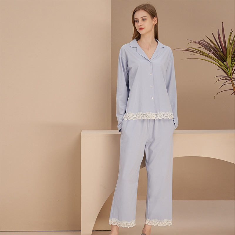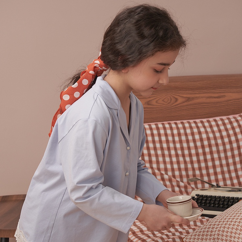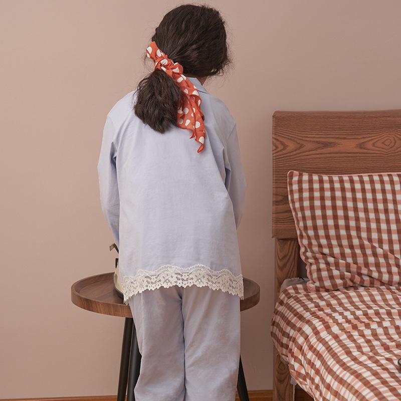 Spring And Summer Cotton Solid Color Pajamas For Middle And Large Children And Girls,Long-sleeved Two-piece Suits With Lace,Can Be Worn Outside As Home Clothes
