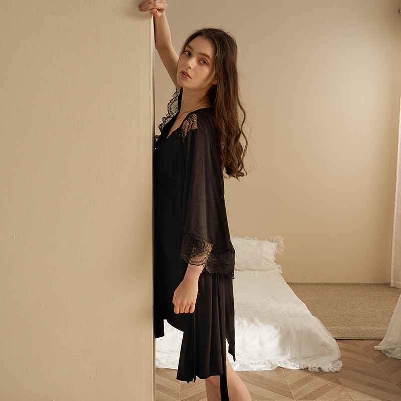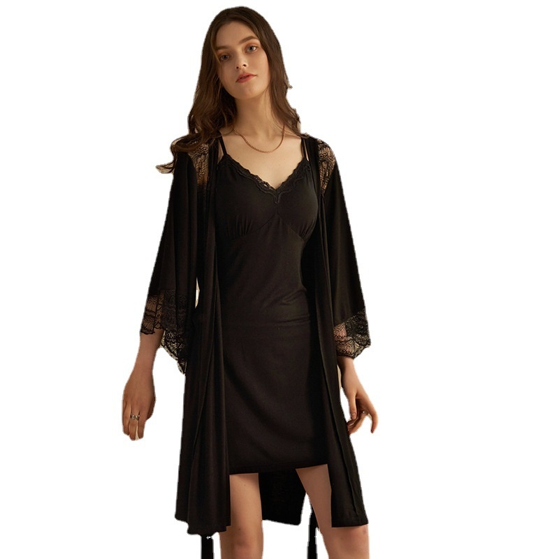 Spring And Summer Solid Color Modal Lace Two-piece Suit Small Sling Long Nightgown Soft Home Clothes With Chest Pad