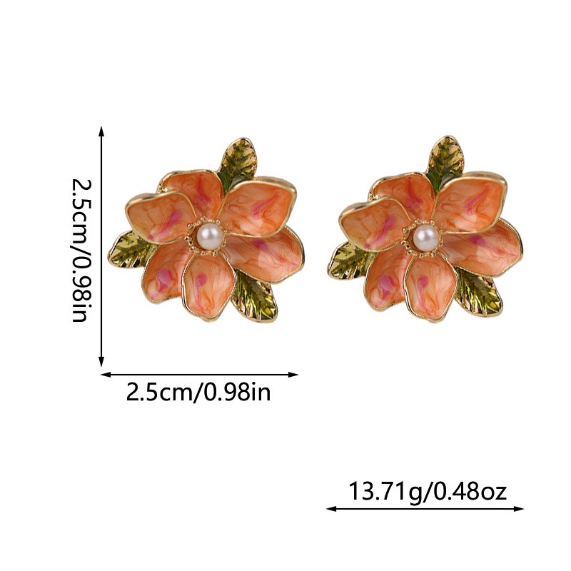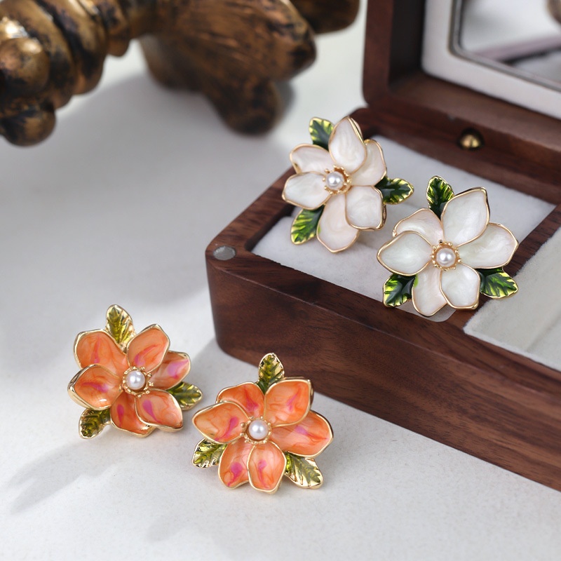 Silver Needle Oil Drop Flower Earrings French All-match Gardenia Enamel Pearl Earrings Personality Light Luxury Leaf Earrings