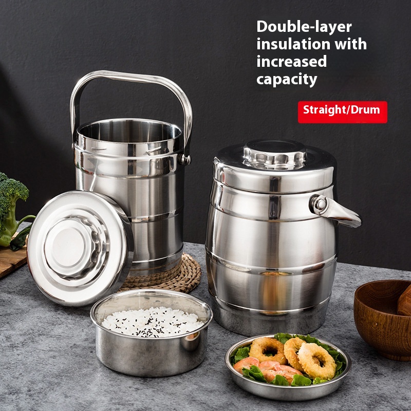 Non-magnetic Stainless Steel Double-layer Pot For Office Workers And Students To Keep Warm Lunch Box Bowl Drum-shaped Vacuumulation Bucket Convenient Rice Bucket