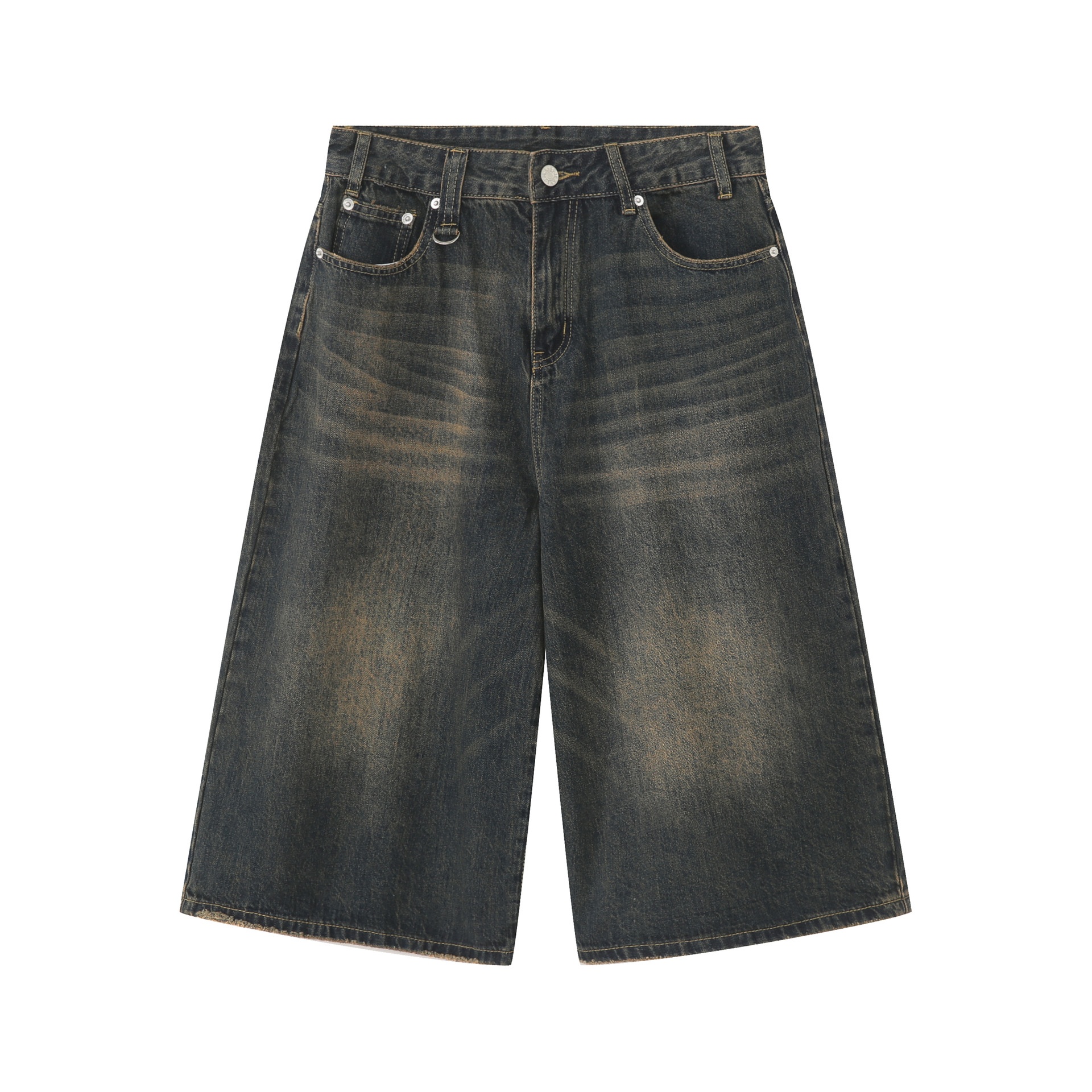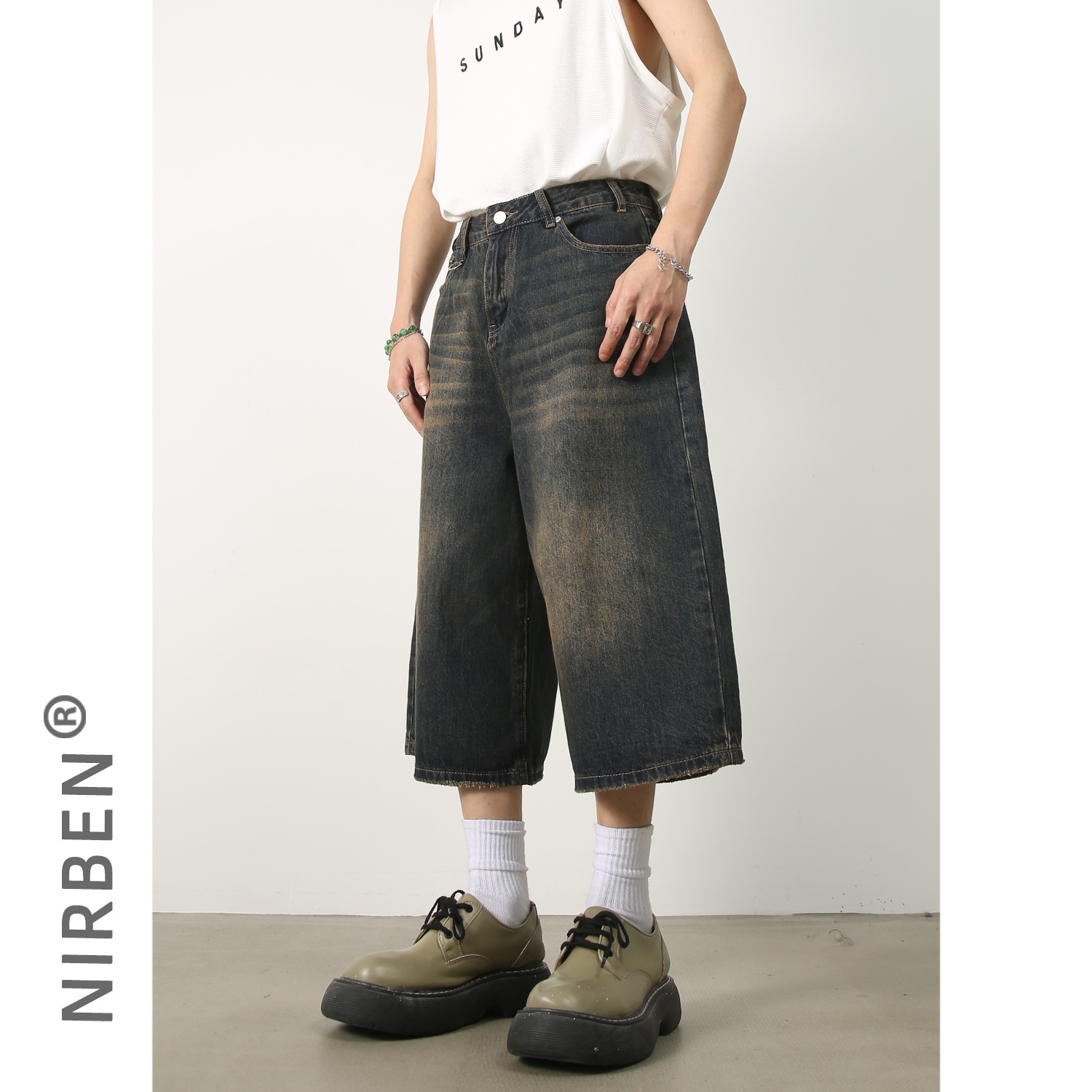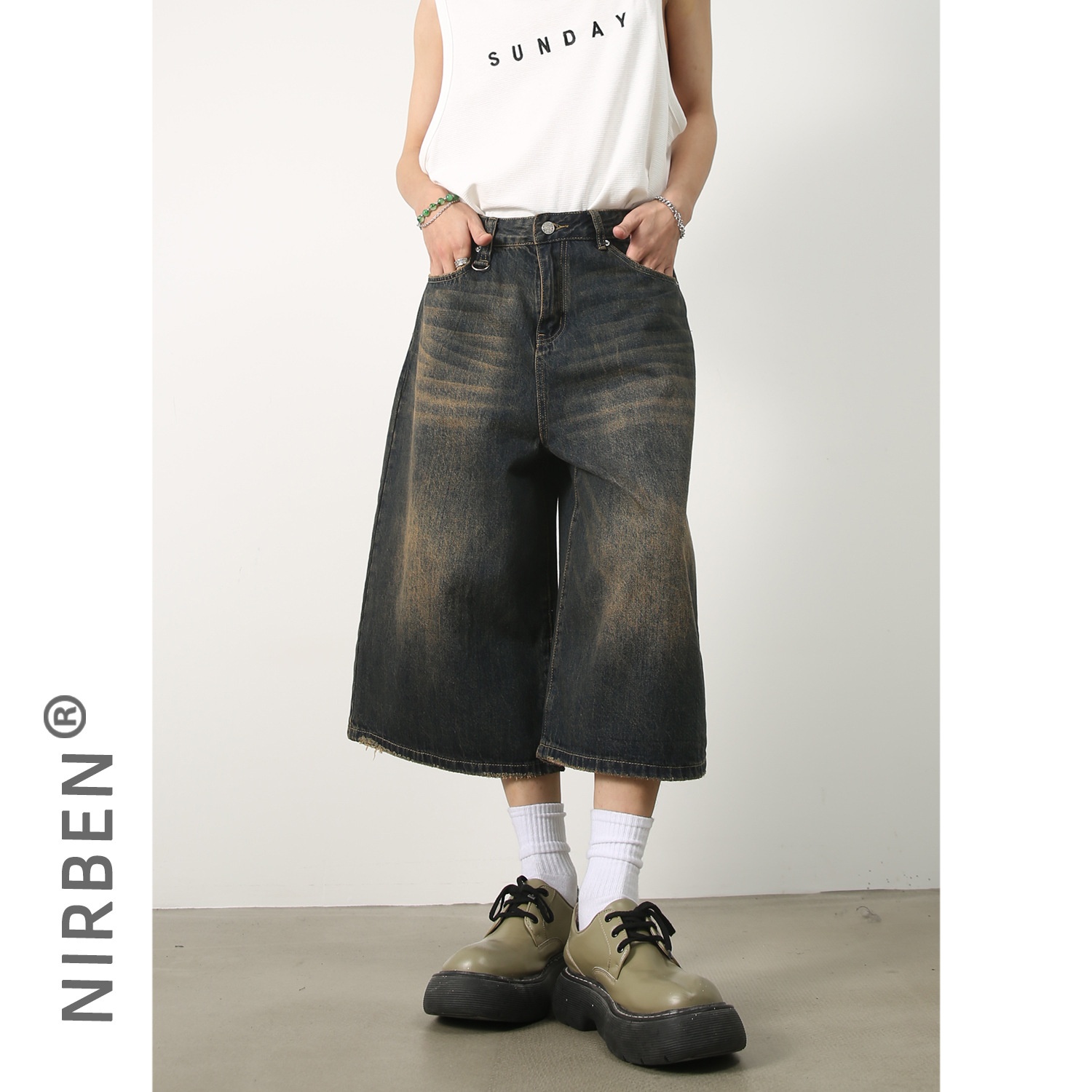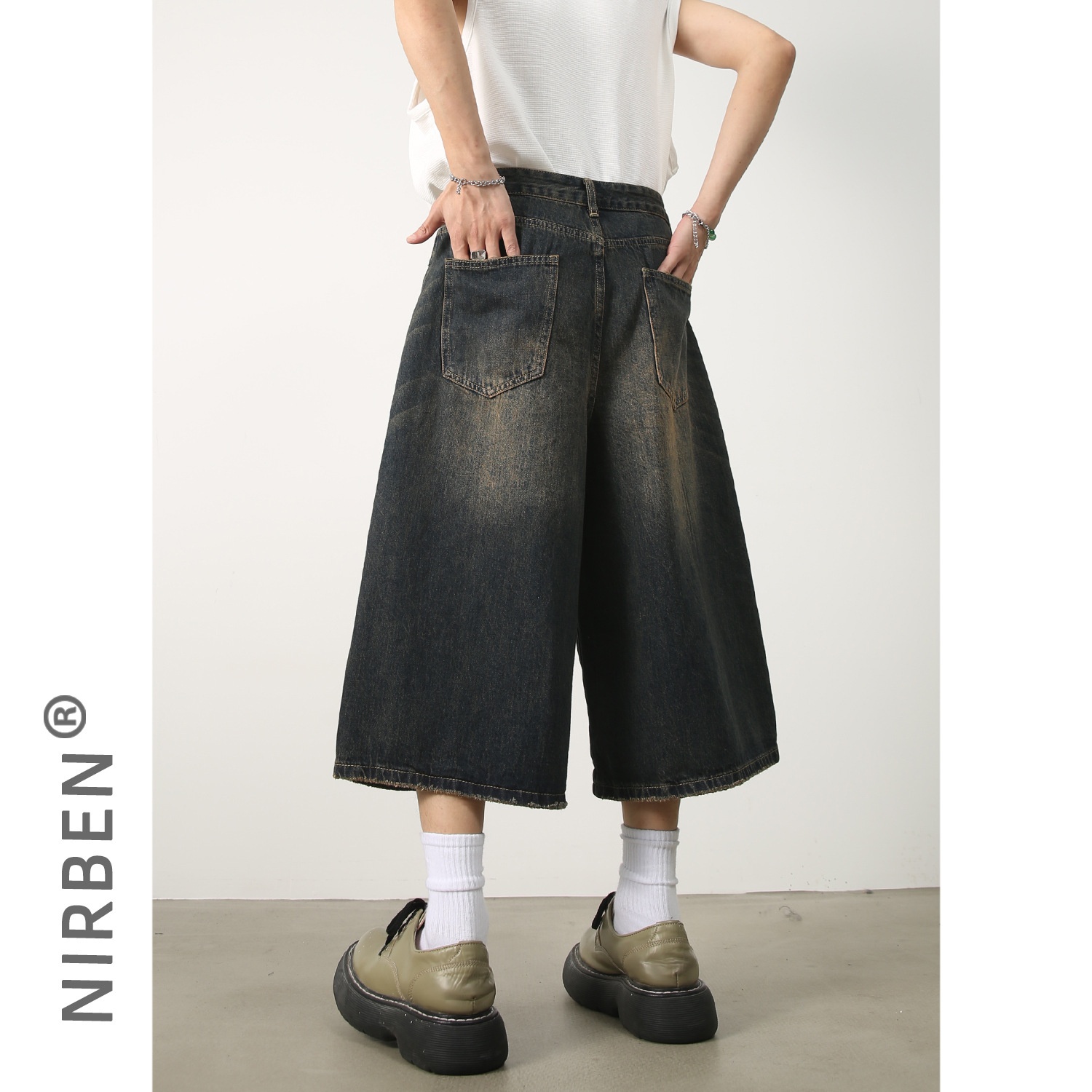 Nirben Denim|American Retro Distressed Denim Shorts Versatile Loose Wide-leg Straight Cropped Trousers