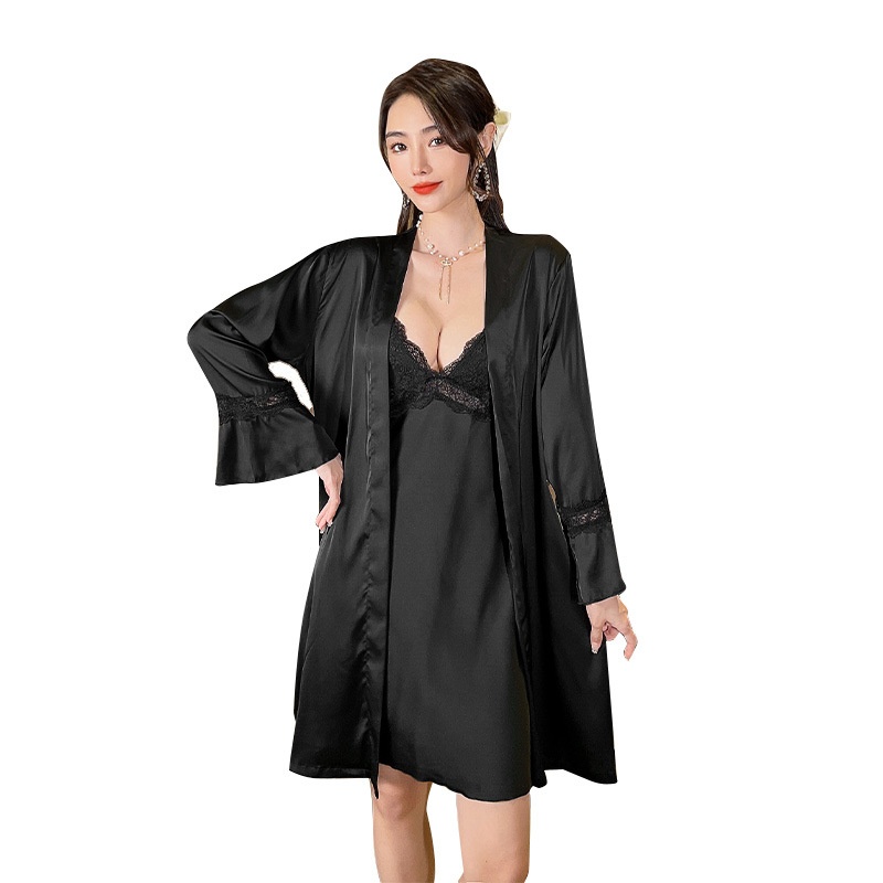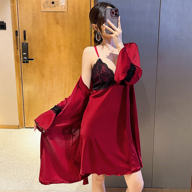 Korean Ice Silk Nightgown Two-piece Lace Stitching Low-cut Backless Suspender Skirt Women's Spring And Summer Thin Pajamas Set