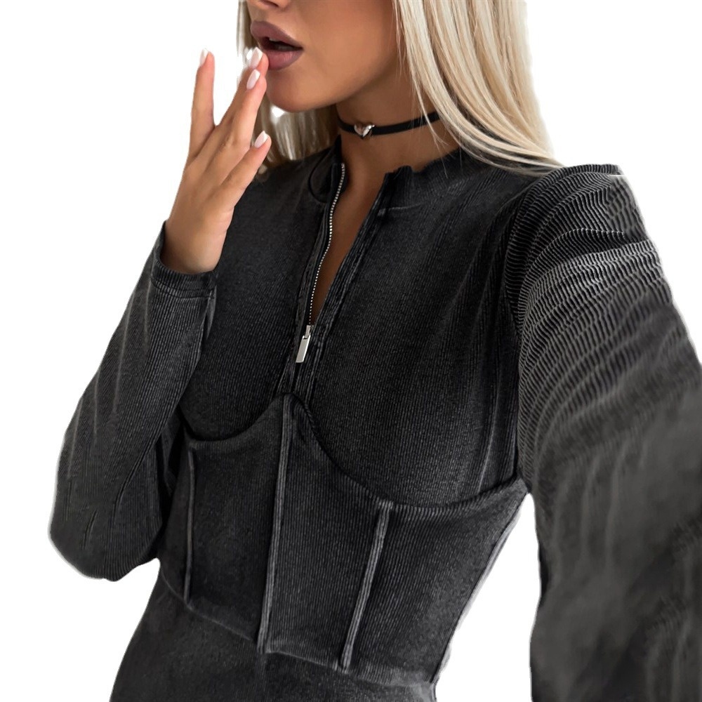 Blogger Casual Style Old Zipper Jacket Women's Spring And Autumn Splicing Fishbone Waist Slim Fit Short Top