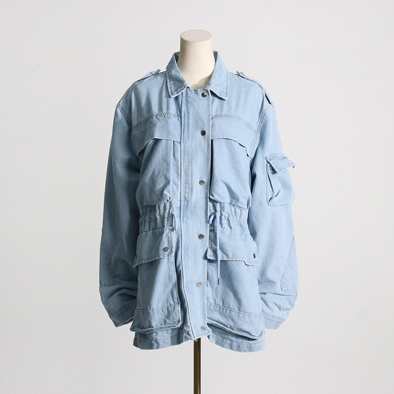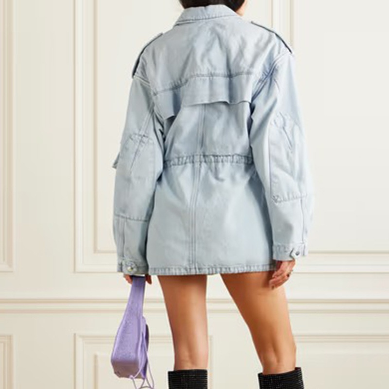 Fashionable Utility-Style Denim Jacket For Women:Mid-Length,Slim-Fit Design With Multiple Pockets And Cinched Waist