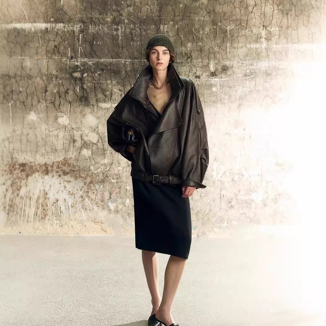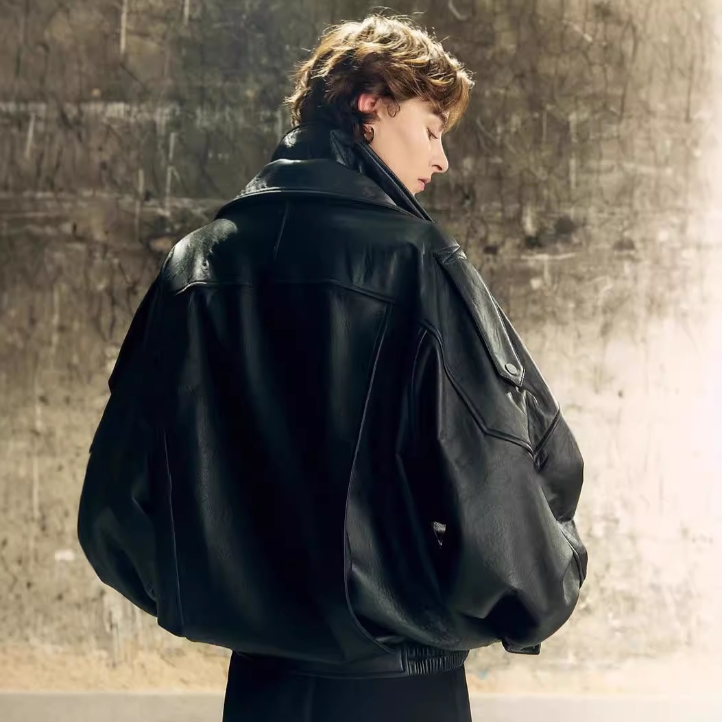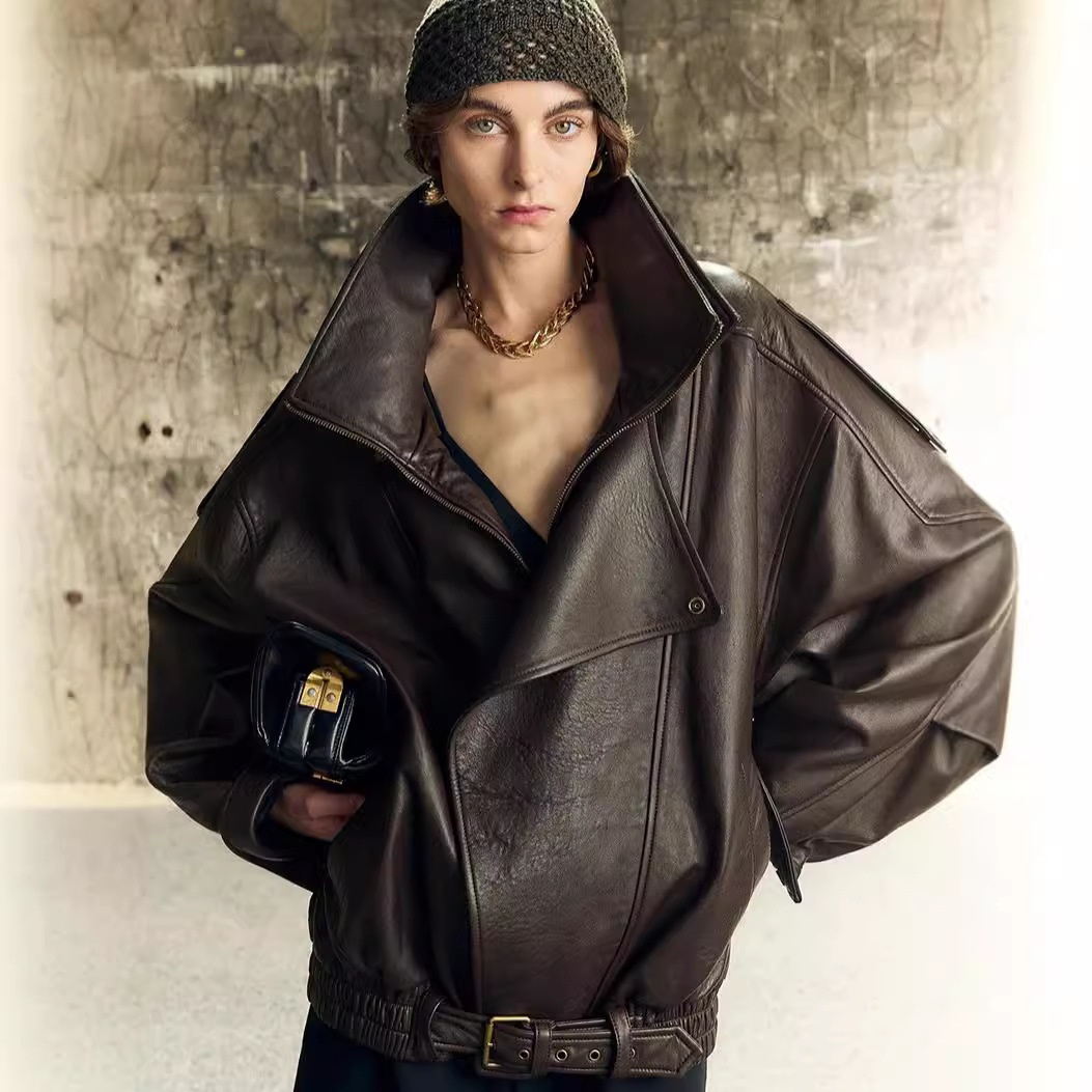 Modern High Street British Lamb Foam Leather Double Collar Leather Jacket Autumn Sleeves Silhouette Heavy Leather Jacket