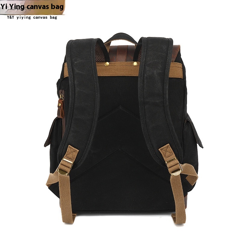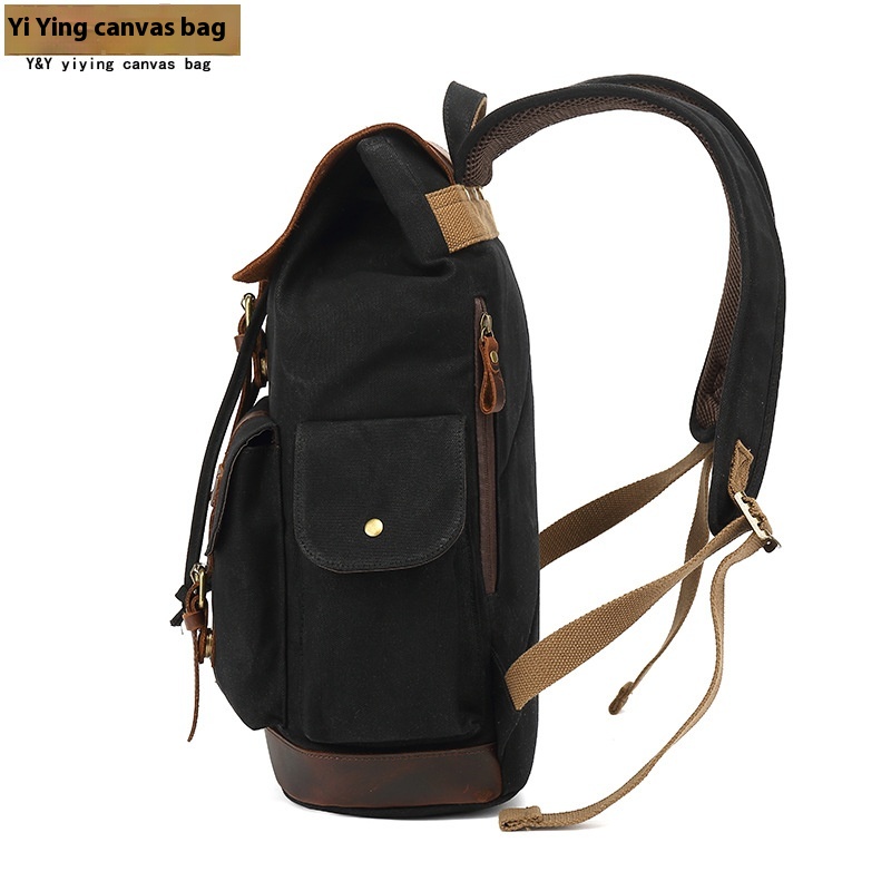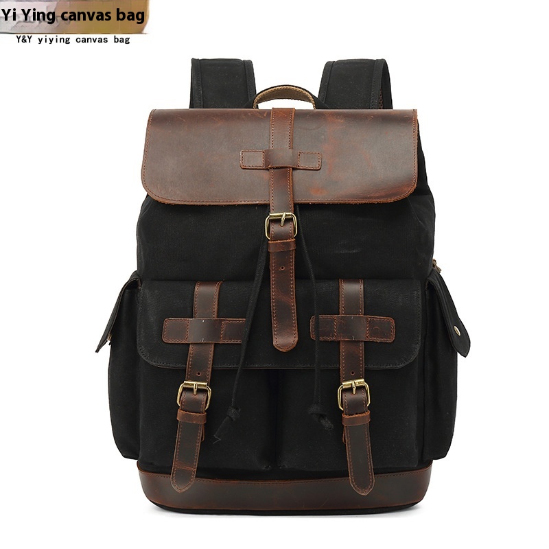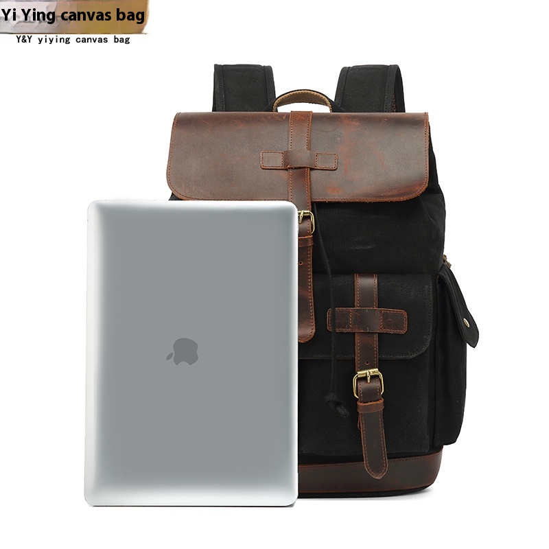 Backpack Men's Travel Computer Backpack Student Retro Travel Book Bag Waxed Canvas With Top Layer Leather