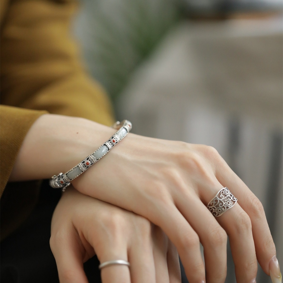 S925 Silver Smoky Purple Princess Bangle With Hollowed Bamboo And Flower Design,Featuring Hetian Jade