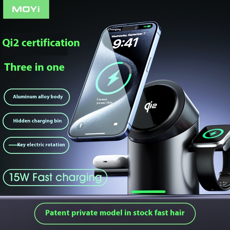 Qi2 Certified Mag Safe Magnetic3-in-1 Wireless Charger Fast Charging Phone Stand With Rotating Desktop Charging Station