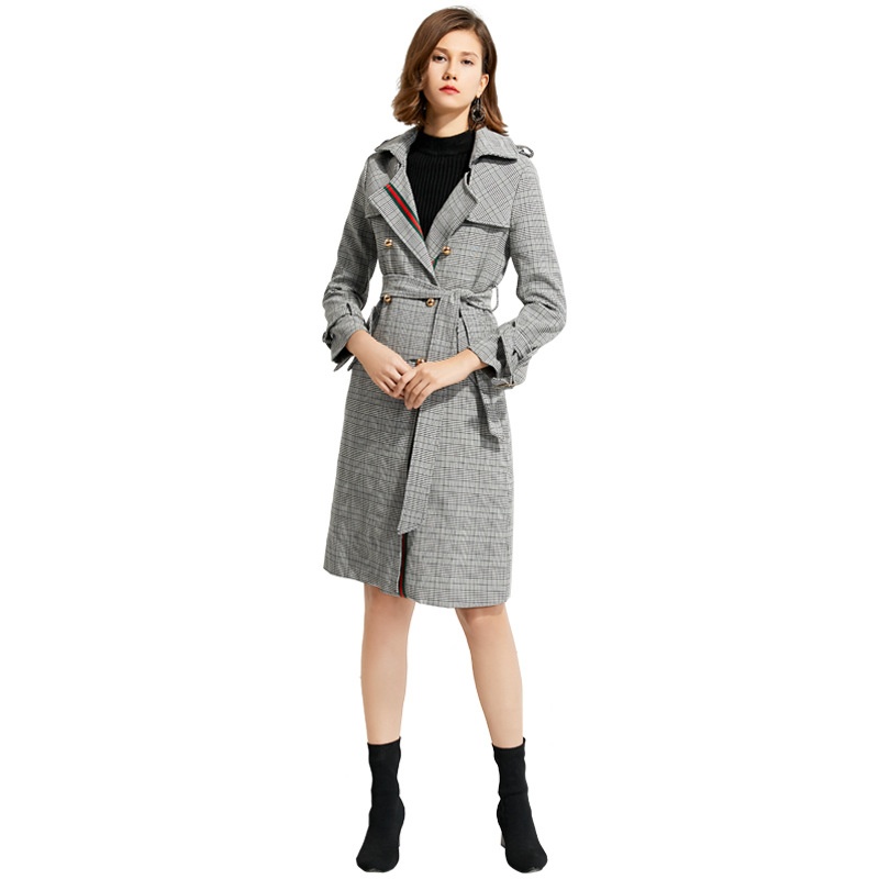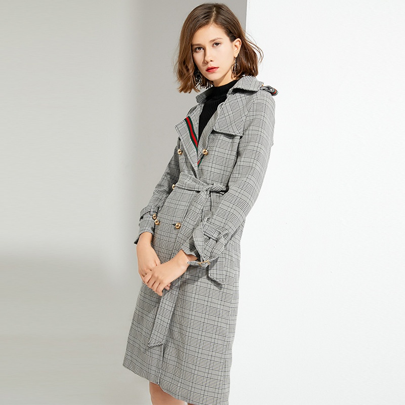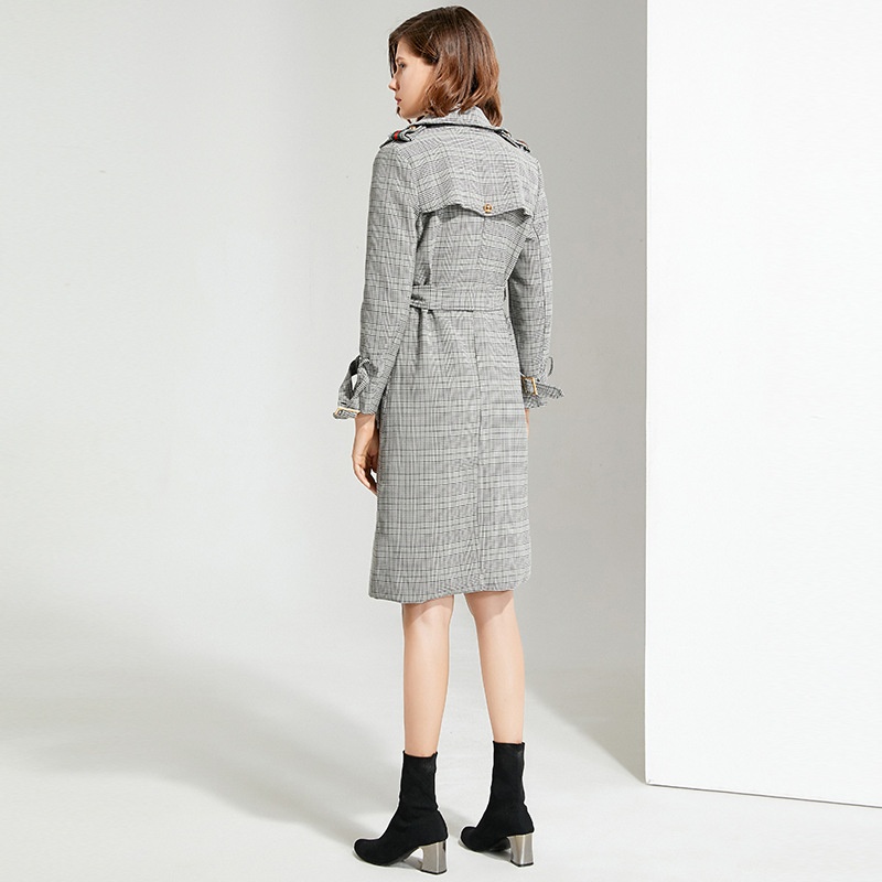 Mid-Length Plaid Trench Coat:Waist-Cinching Slim-Fit Overcoat