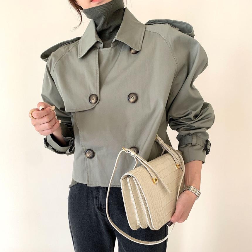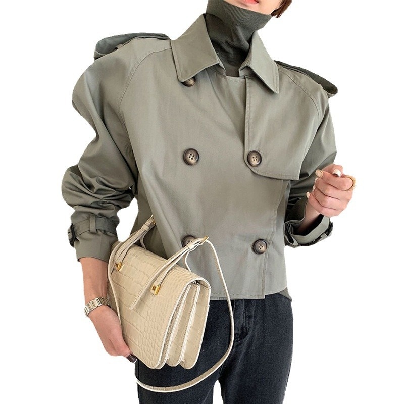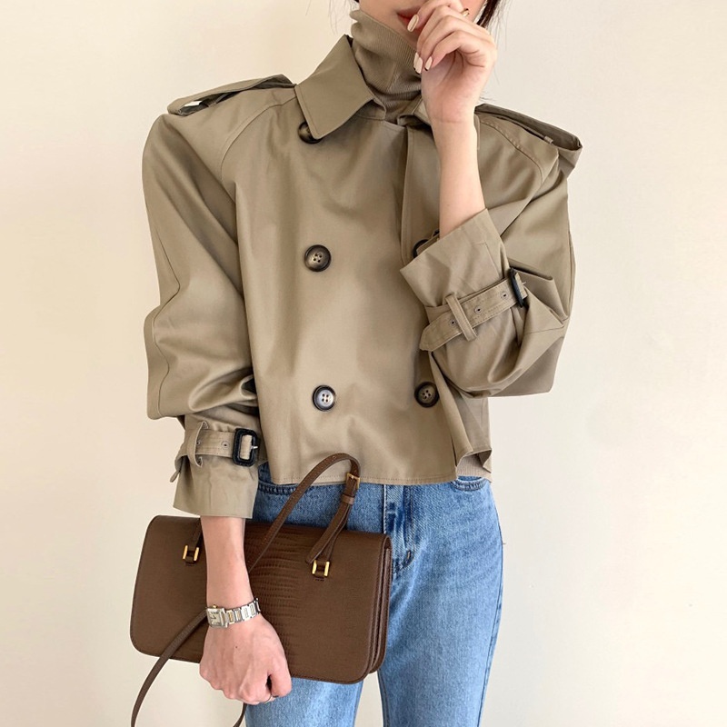 British-Style Short Trench Coat:Lapel Collar,Double-Breasted Design,And Long Sleeves