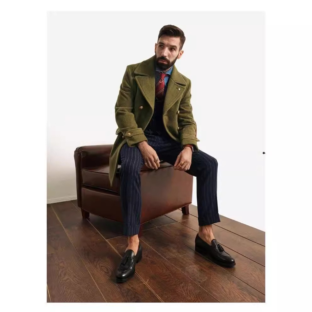 Army Green Coat Button Design Long Lapel British Distinctive Woolen Coat