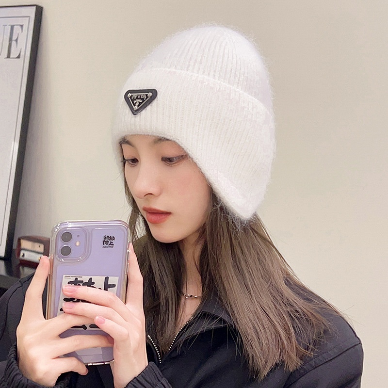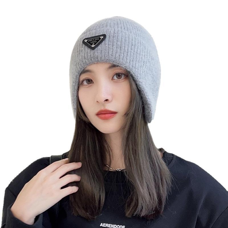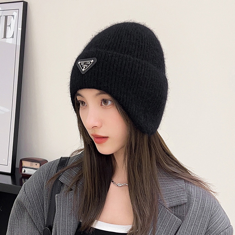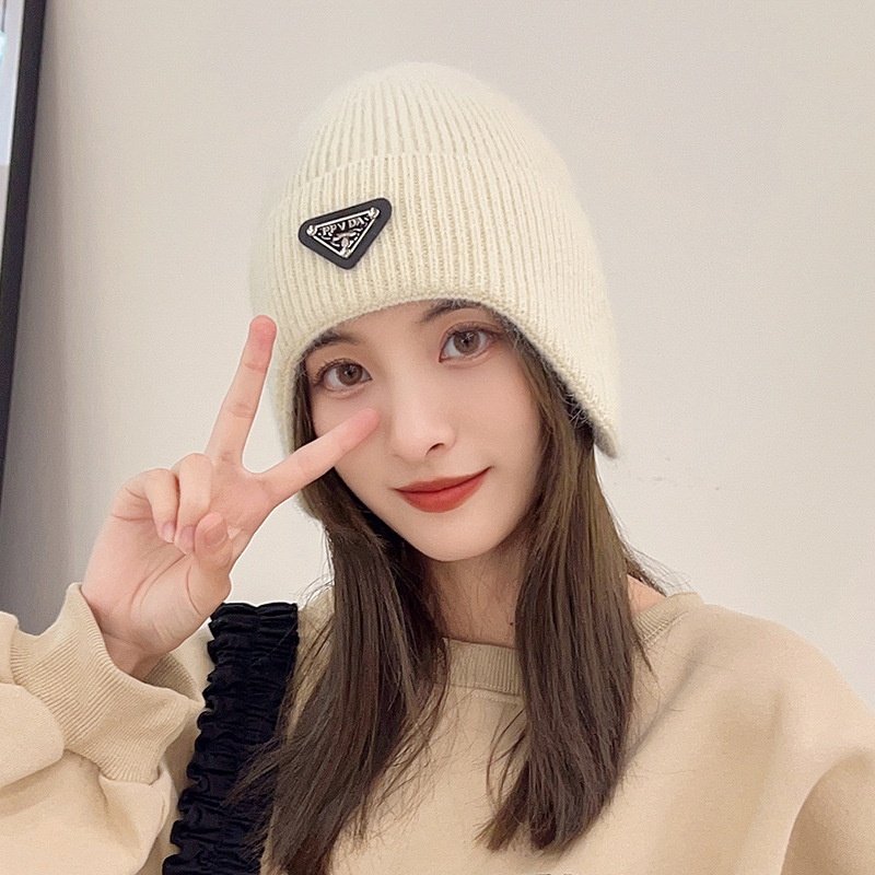 Rabbit Fur Hat For Women Autumn And Winter Versatile Fashion Triangle Label Ear Protection Winter Plus Velvet Warm Pink Knitted Wool Hat